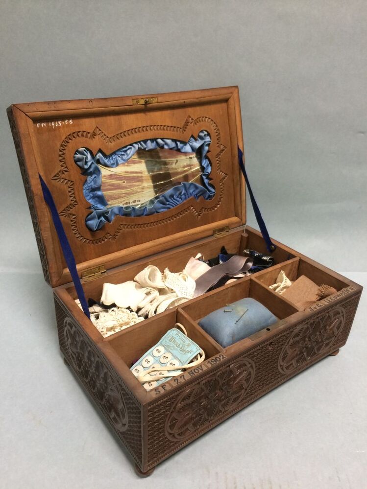 Dozen om instrumenten en werkmaterialen in te doen, met name naaigerei. (AAT) https://data.cultureelerfgoed.nl/term/id/cht/7e0bdbf0-2506-4616-9e3d-67222a4fb086