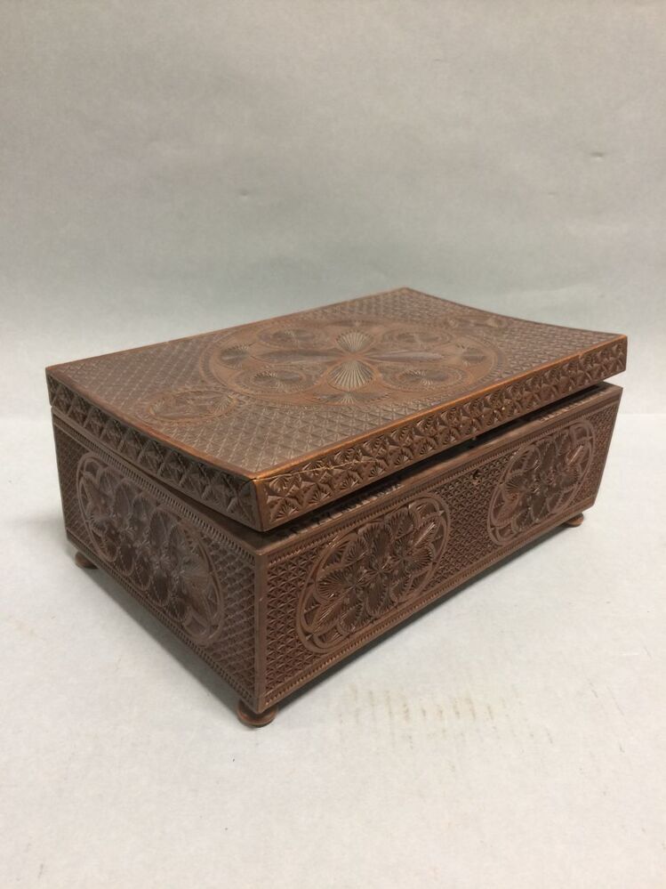 Langwerpig rechthoekige naaidoos, rustend op vier gedraaide houten pootjes, scharnierend deksel