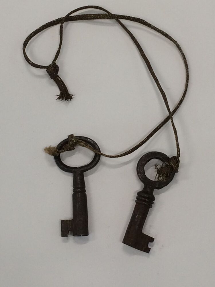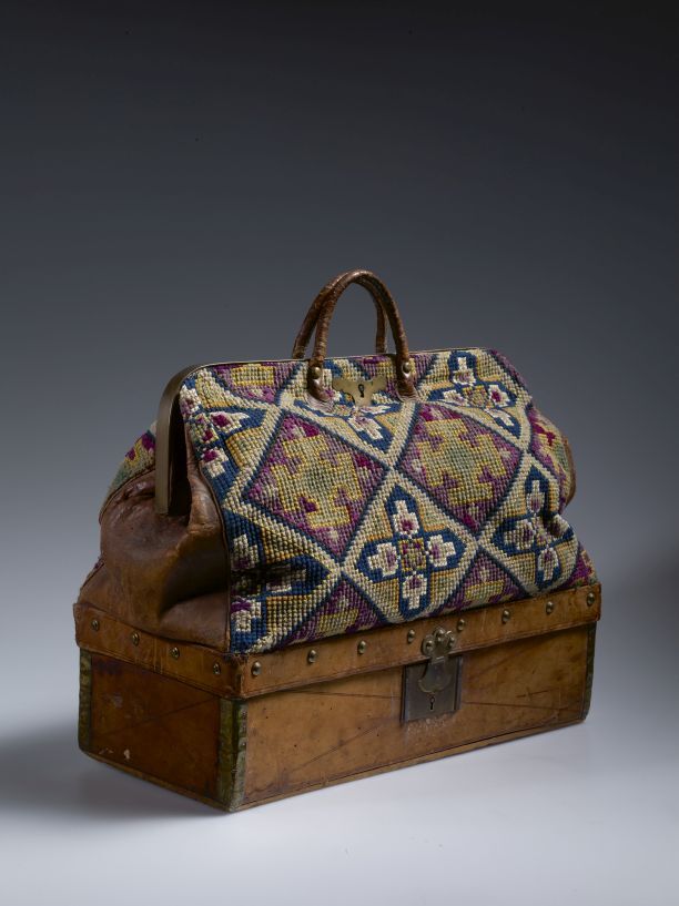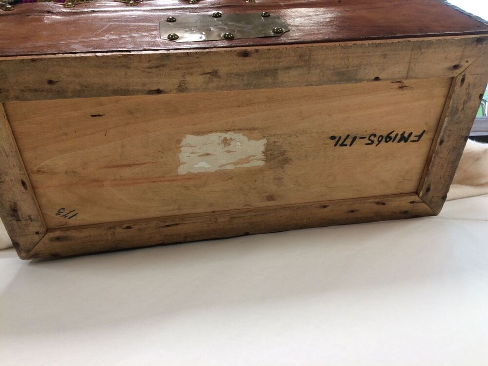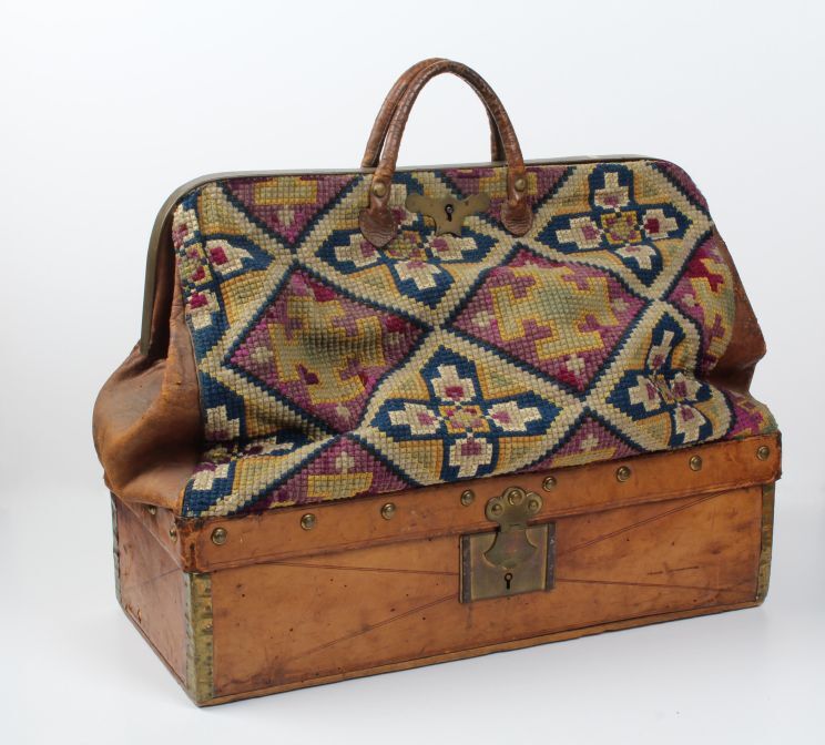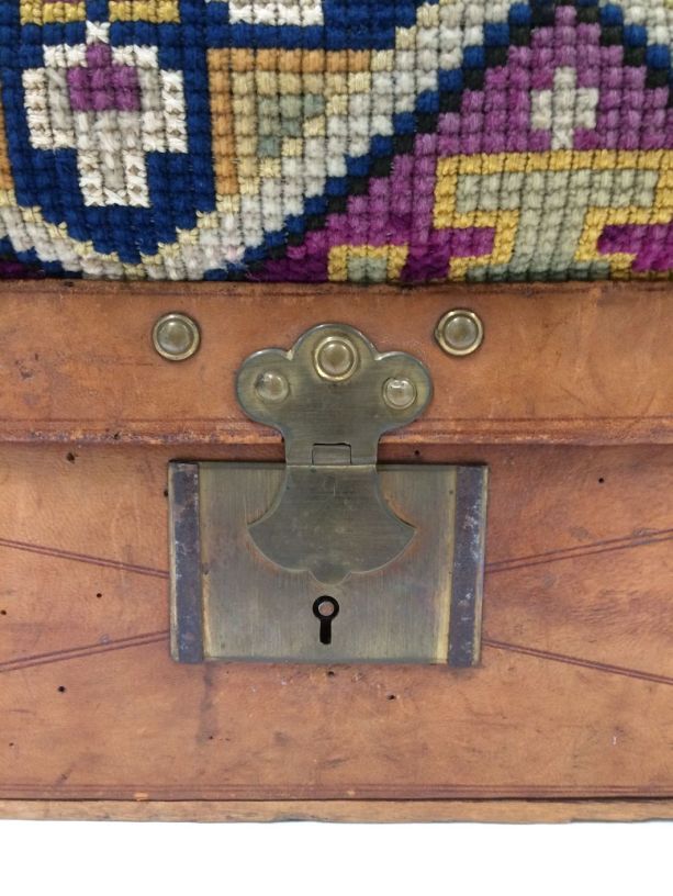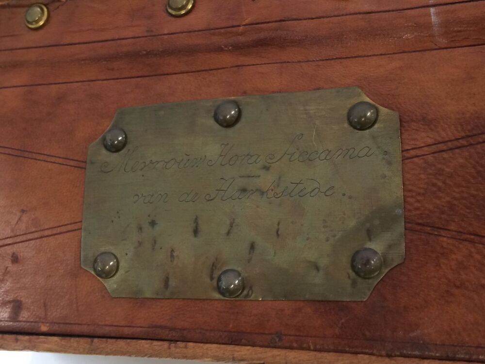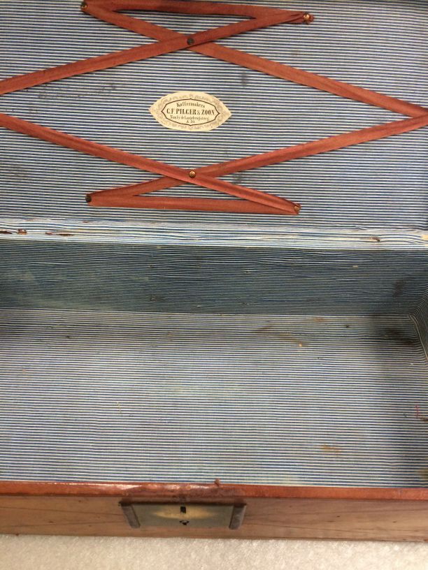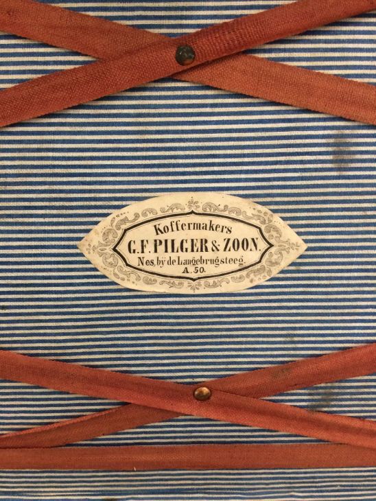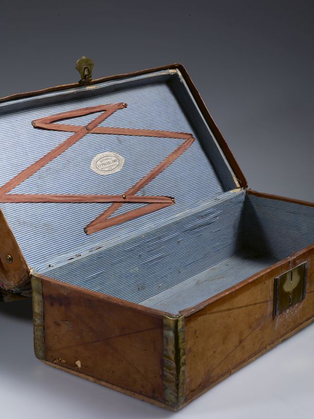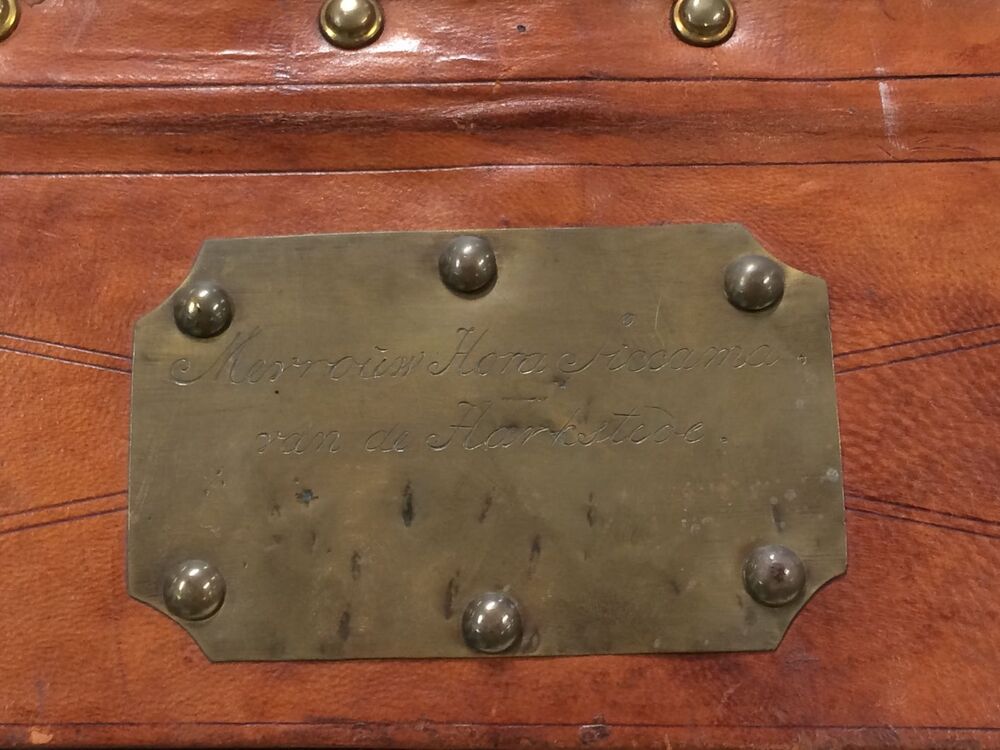 Reistas, het ondereind is een langwerpig rechthoekige bak van buiten bekleed met bruin leer en voorzien van deksel met slot