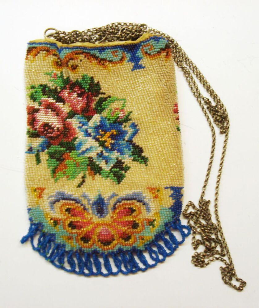 Tasje gebreid met kralen, wit fond met bloem, blauwe voering van wit katoen aan ringetjes met ketting