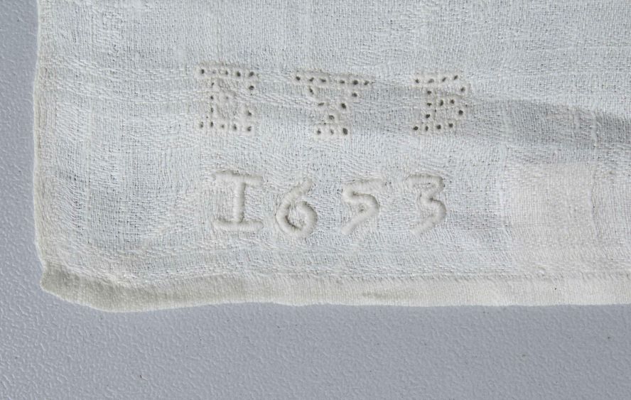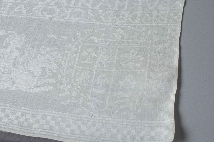 Servet van wit linnen damast met spiegelend patroon van poseidon met drietand en zeedieren, wapen en naaminweving, onderdeel van groep van achttien