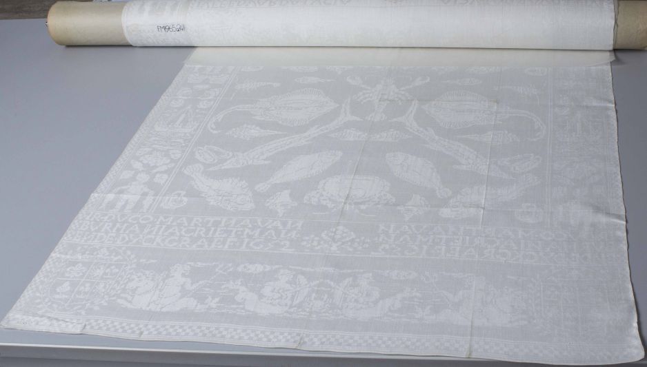 Servet van wit linnen damast met spiegelend patroon van poseidon met drietand en zeedieren, wapen en naaminweving, onderdeel van groep van achttien