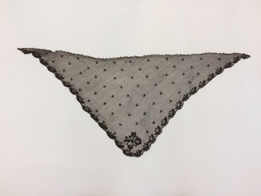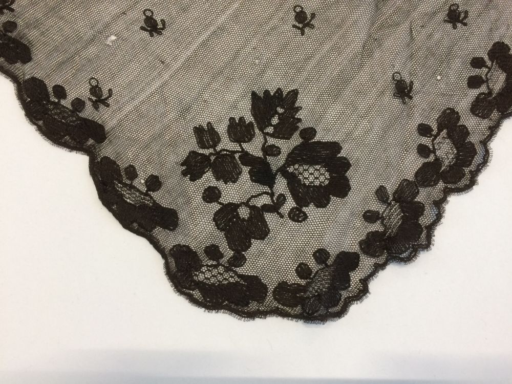 Driekante fichu van zwart machinale zijden tule met floraal doorstopwerk in zwart