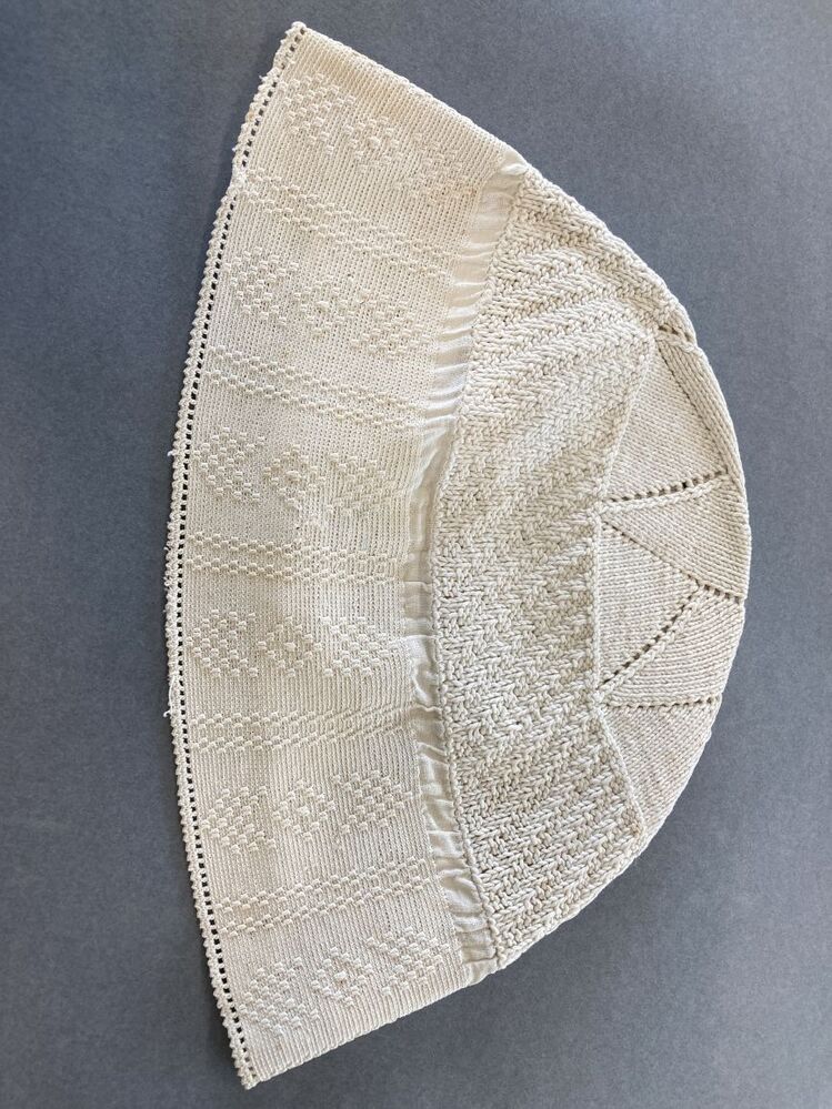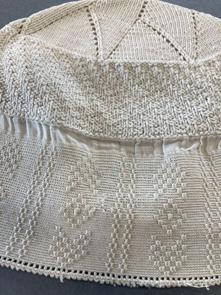 Gebreide wit katoenen oorijzer ondermuts, met gehaakte strook met vertikale randen