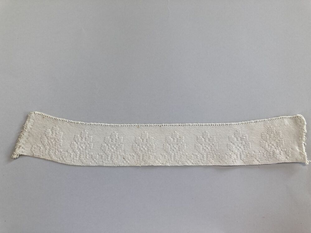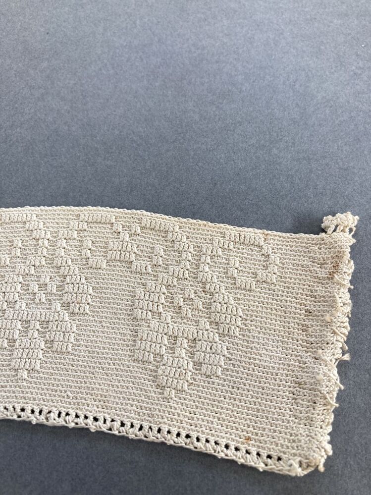 Tipmutsstrook in reliefhaakwerk van wit katoen met patroon van symmetrische bladvormen, onderdeel van groep van twee