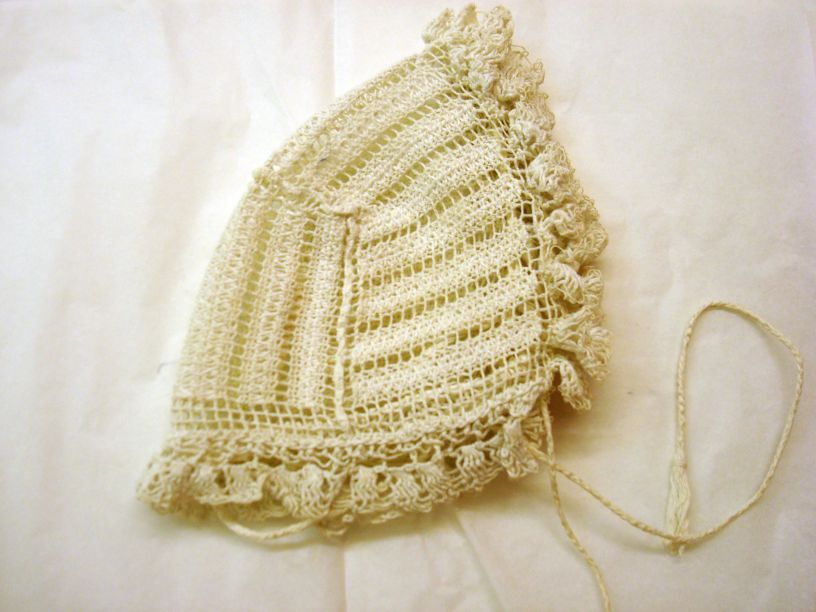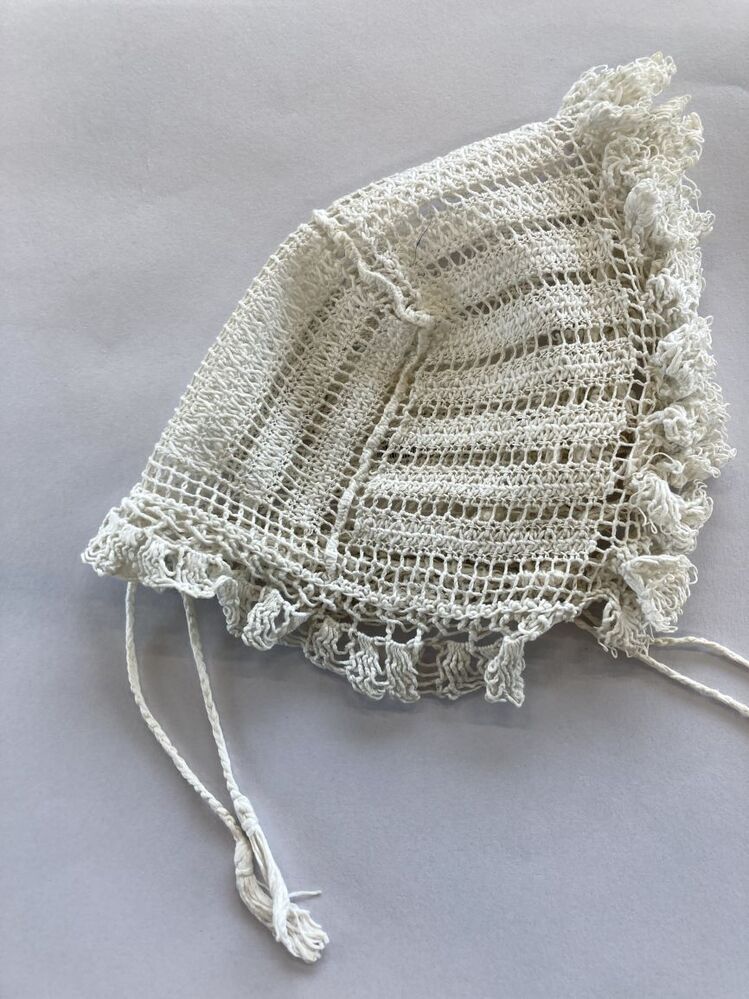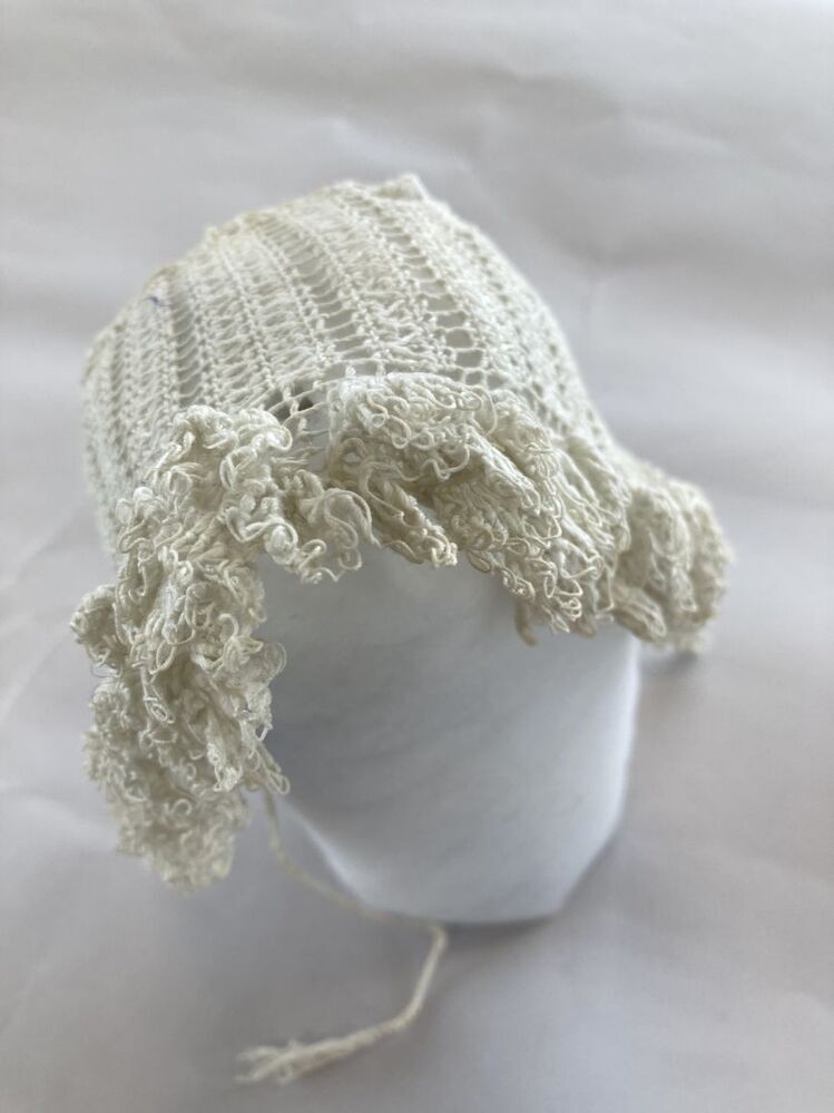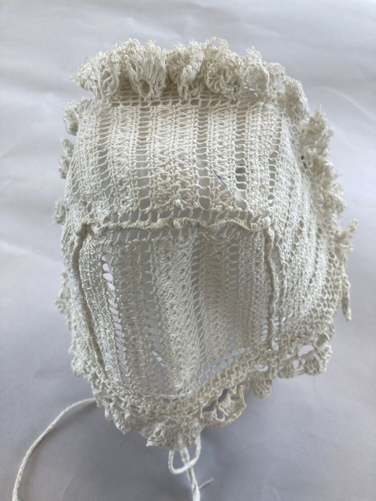 Wit kindermutsje van doorgestopt filetknoopwerk., met'hanekam'