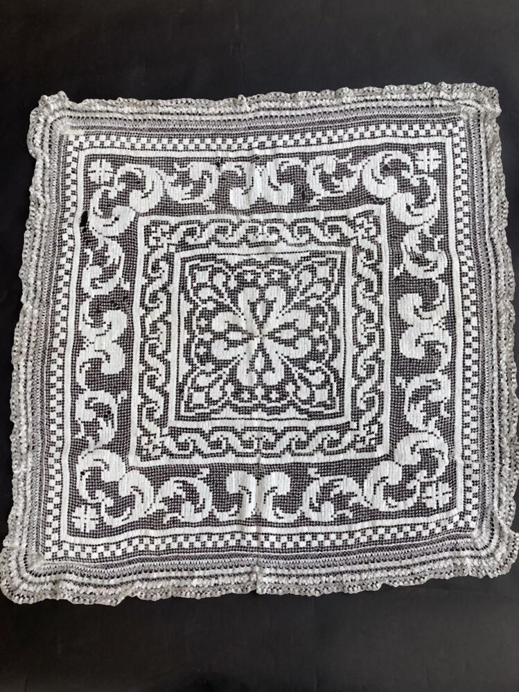 Tafelkleed van filetknoopwerk van wit katoengaren, doorgestopt met klassieke motieven in zachter garen