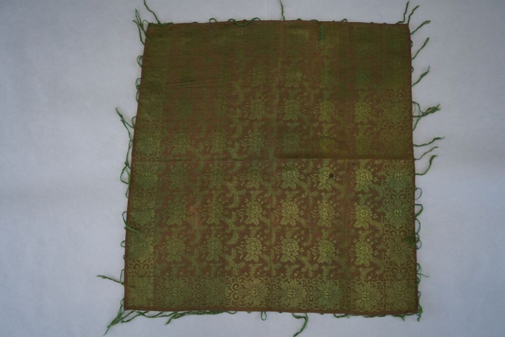 Sjaal van bruin katoen met glanzende groene zijden bloempatronen met franje van groene zijde.
