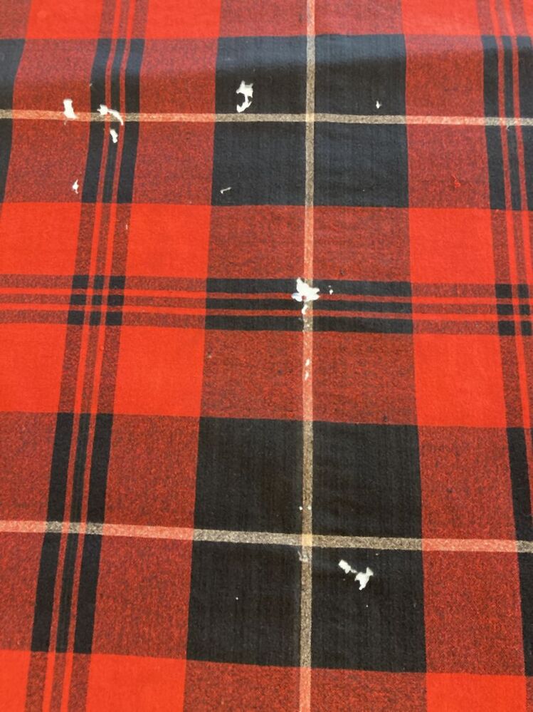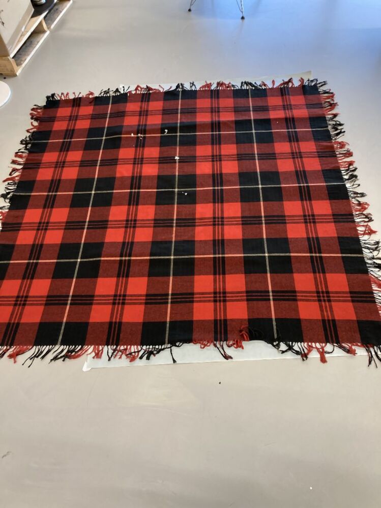 Omslagdoek van wol, met een grote geweven rood-zwarte ruit, afgewisseld met strepen