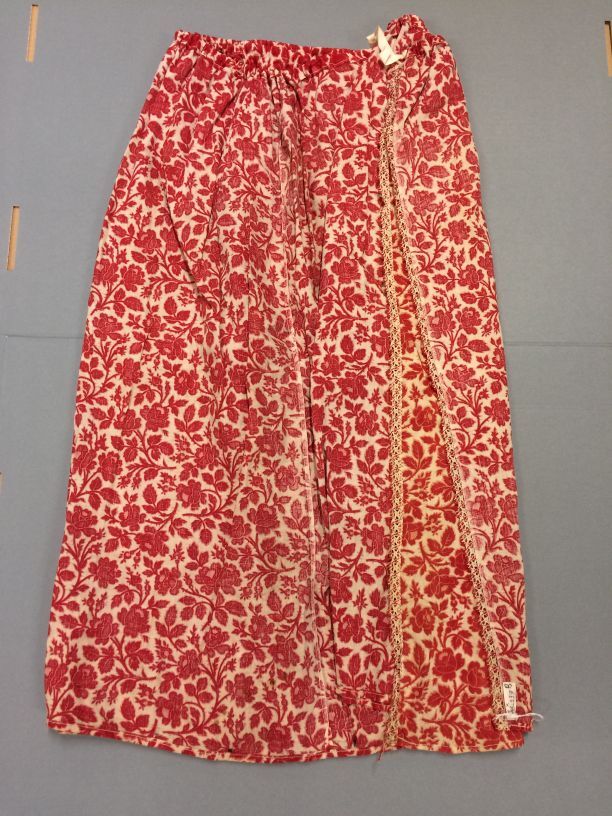 Rood gebloemd kleed voor poppenwieg, onderdeel van groep van elf