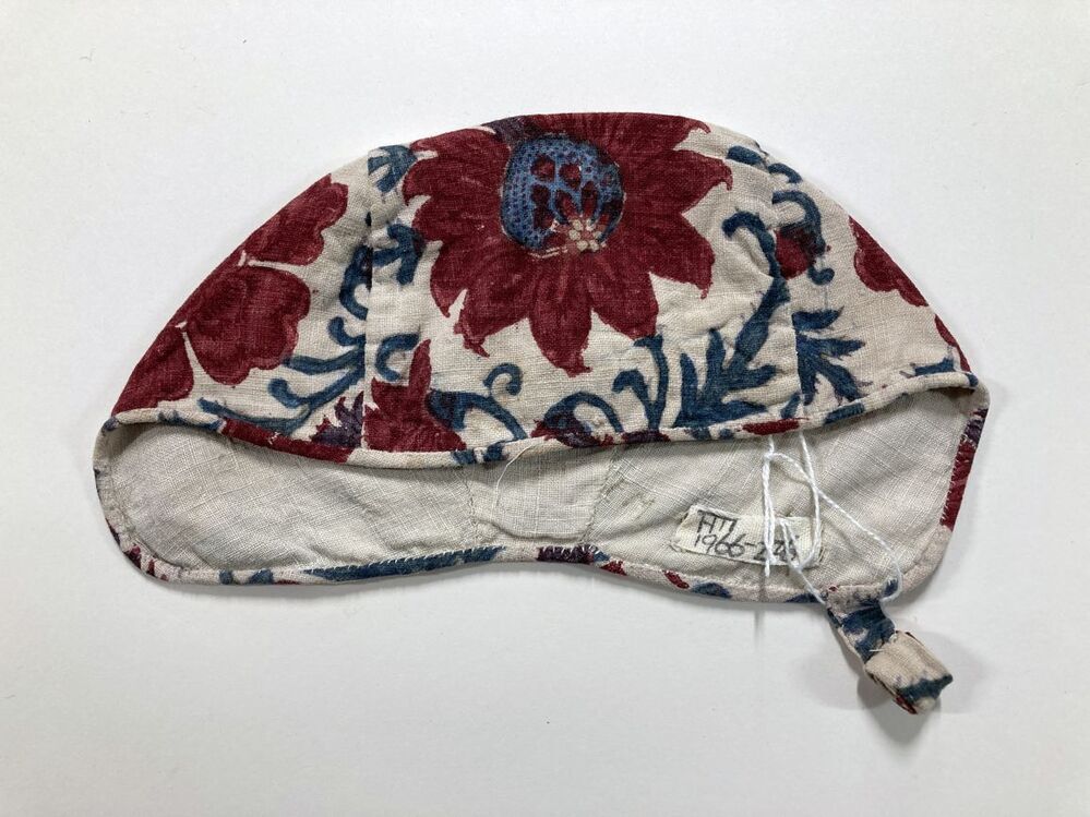 Sitsen meisjesmuts, beschilderd en bedrukt met bloemrank met rozetvormige bloemen witte grond