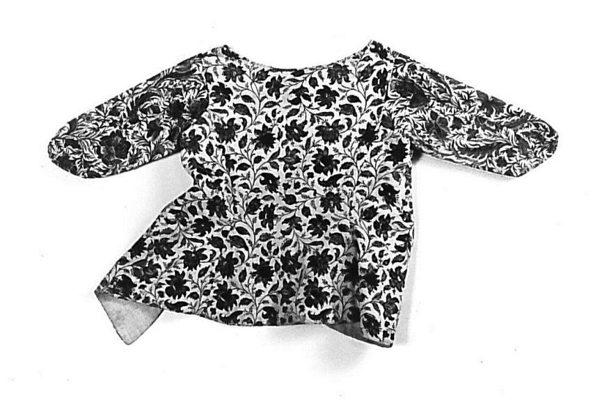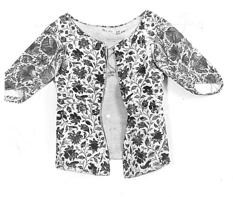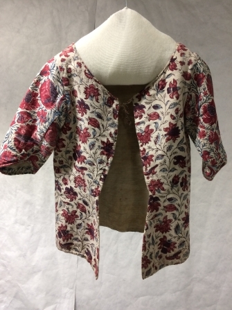 Sitsen vrouwenjak, huisjak met rijgsluiting, lijf van Europese sits met ranken en mouwen met dicht patroon met grote bloemen en insecten op witte grond