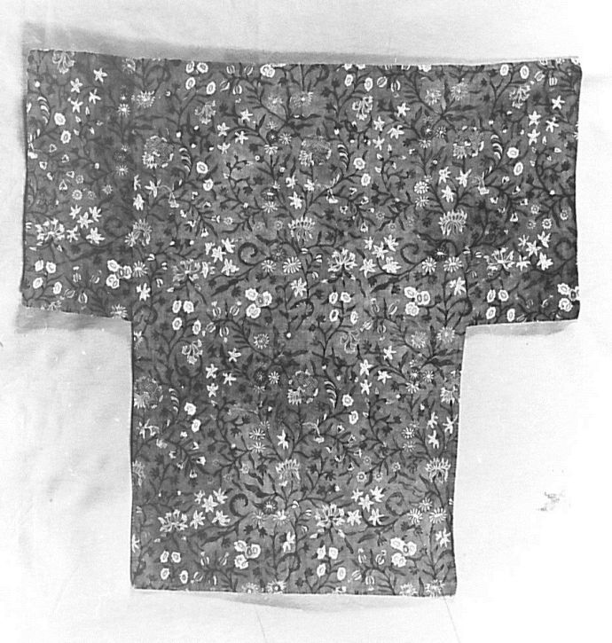 Sitsen wikkelkleed met bloemranken op rode grond, gevoerd met bedrukt katoen met symmetrische krullen en stijve boeketten op witte grond