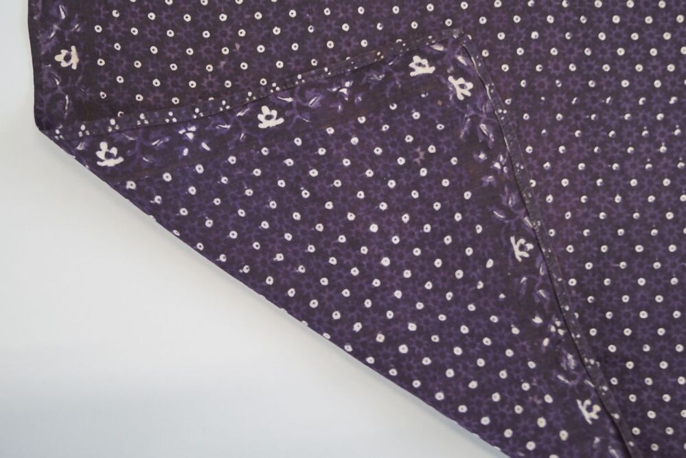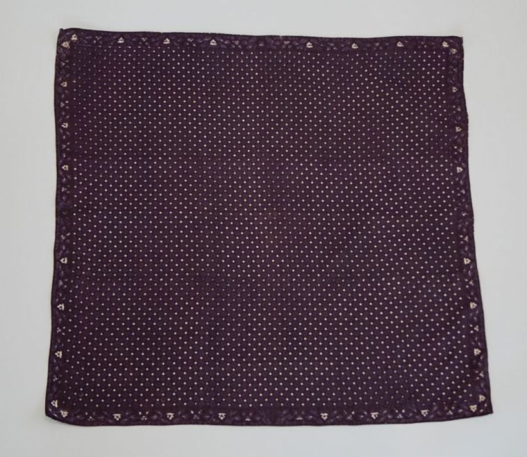 Vierkante bedrukte katoenen doek of sjaal in paars en wit met witte stipjes en lichtpaarse sterretjes in middenveld en smal randje rondom