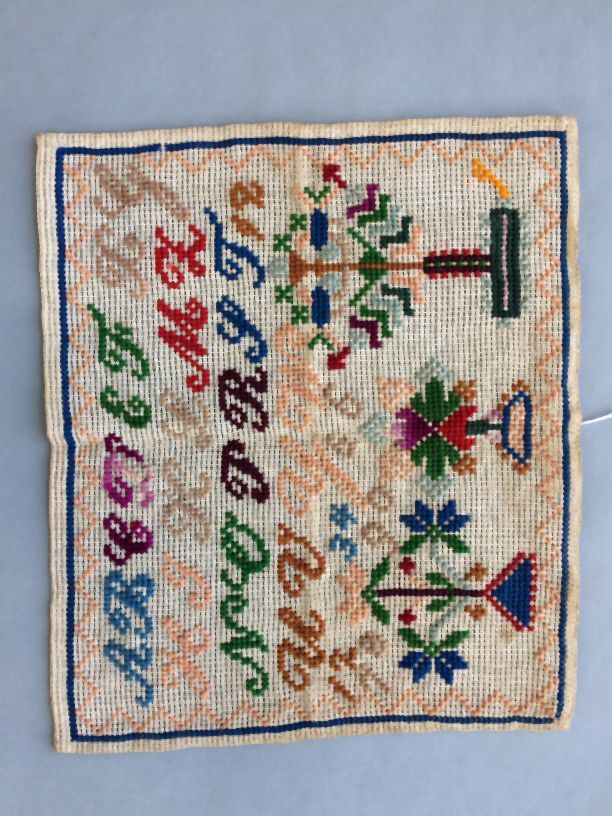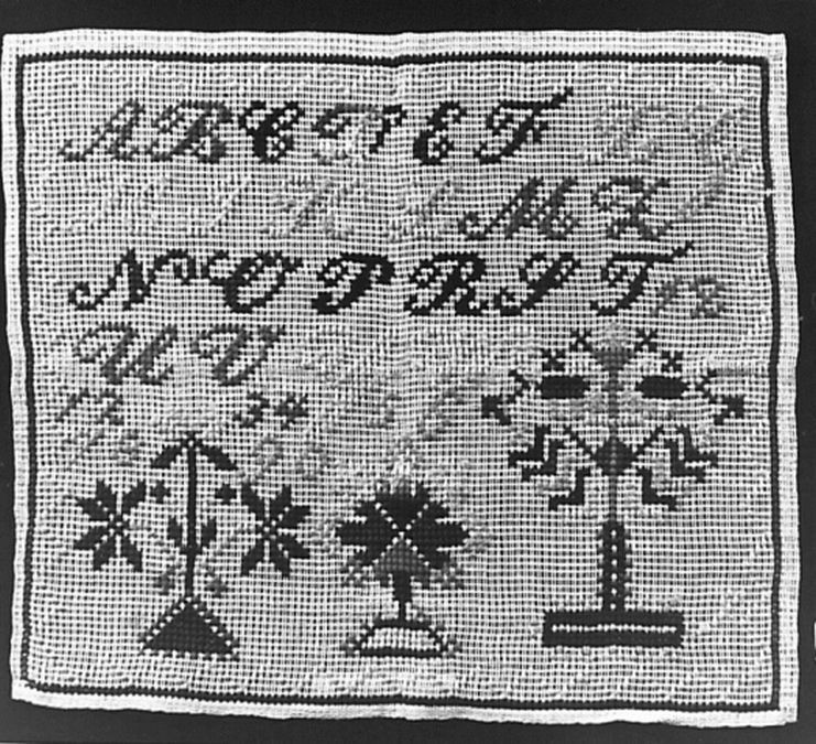 Lettermerklap van stramien, geborduurd met wol, vijf rijen alfabet en enkele merken