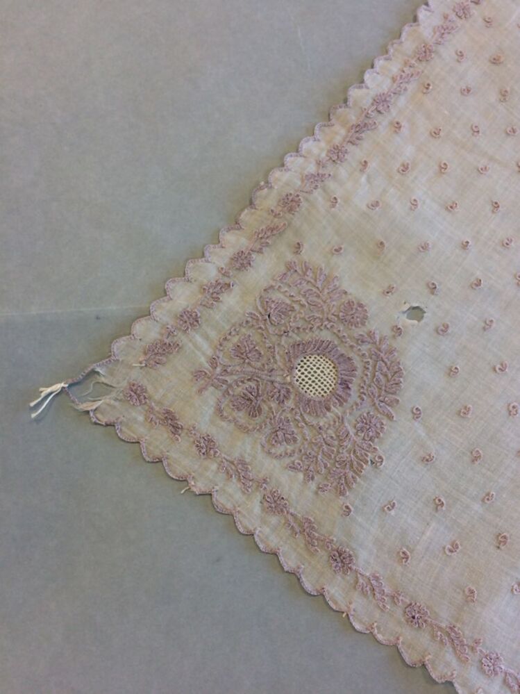 Driehoekige witte fichu met bleek lila tamboureerwerk en Perzisch ajour
