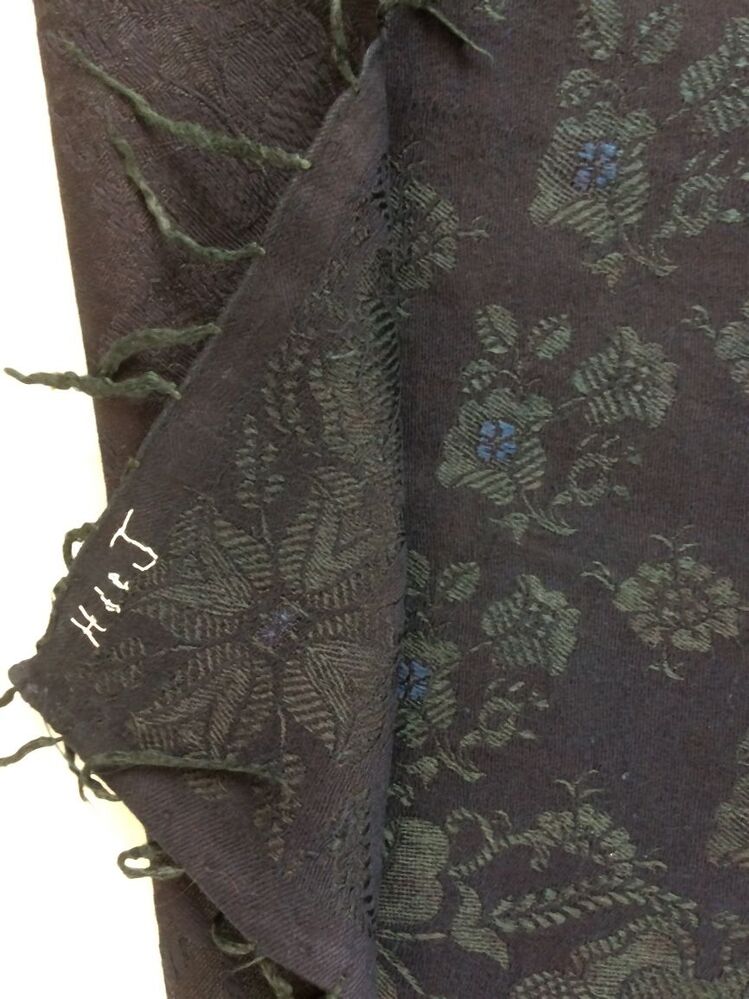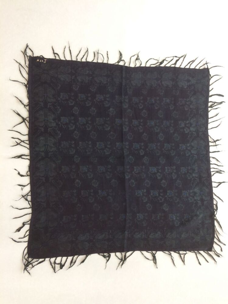 Vierkante doek van blauwzwarte wol, versierd met bloemen in damastpatroon, de randen voorzien van franjes, gewerkt in wit H de J