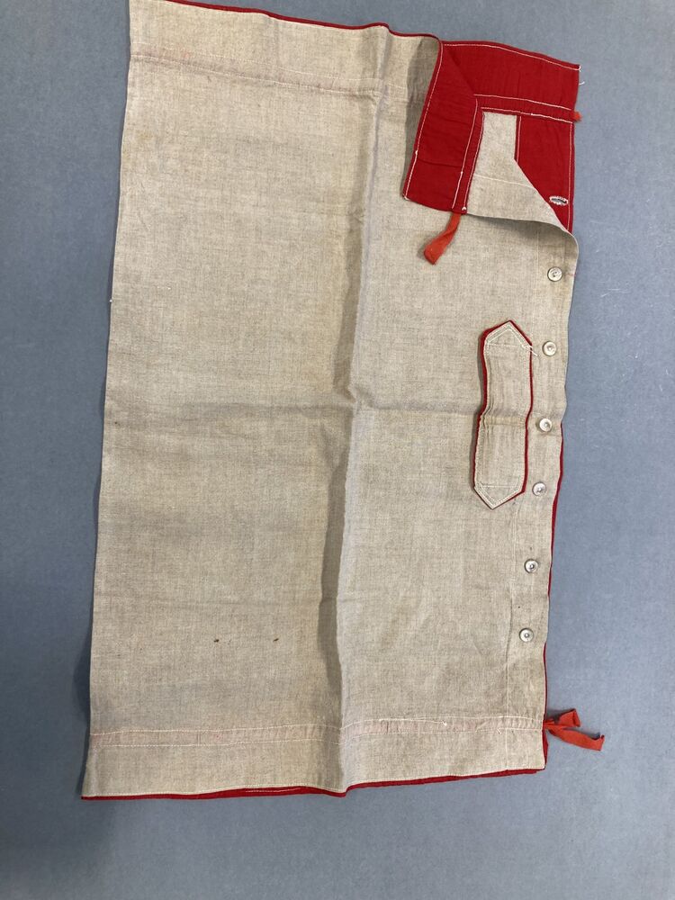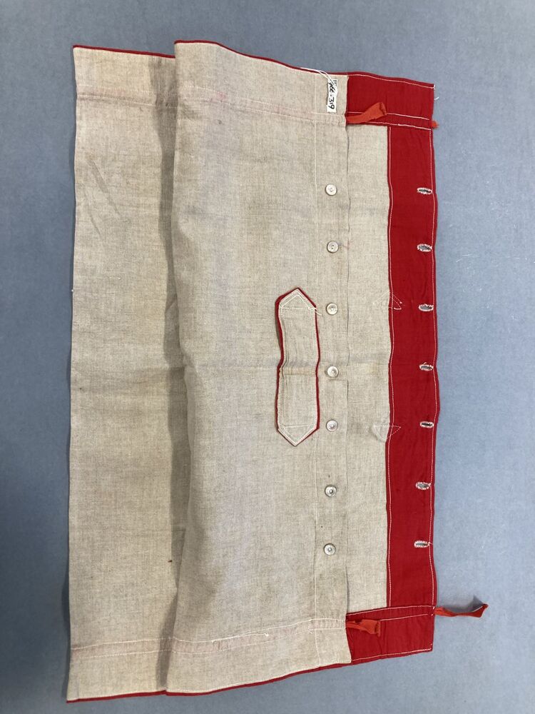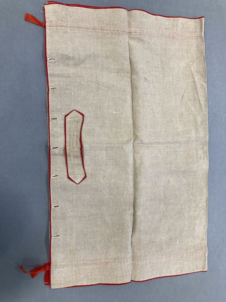 Reiszak of 'baerch', varken, van rechthoekig stuk ongebleekt linnen met twee handgrepen, knoopsgaten en knopen, aan de buitenkant brede rode biezen
