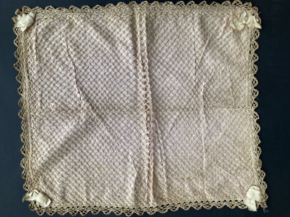 gehaakt luiermandkleedje, ecru, met roze katoengevoerd, in de hoeken een wit zijden strik