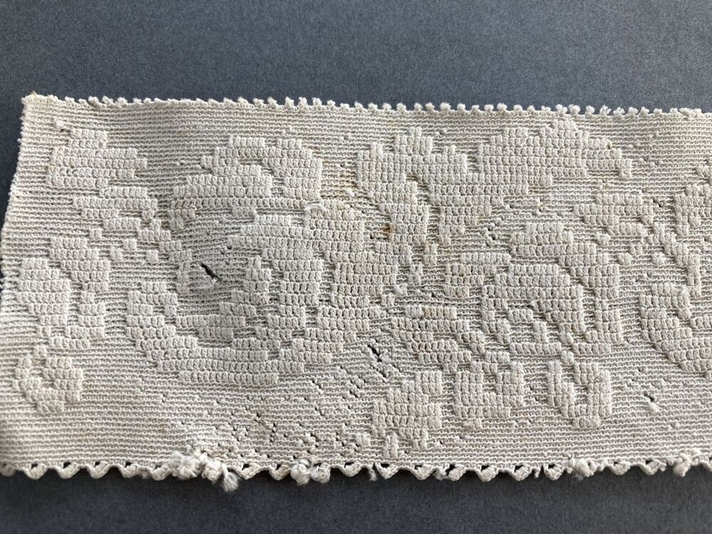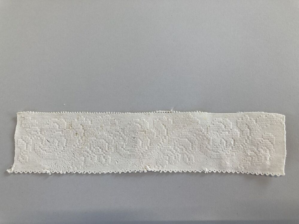 Tipmutsstrook gehaakt van wit katoen, met golvend floraal motief