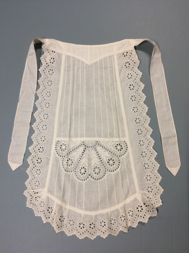 Wit neteldoek schortje met brede gegolfde en opengewerkte kartelrand en twee lange brede banden