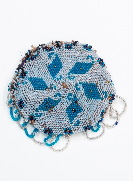 Rond tasje of beursje zonder beugel gebreid met bruin linnen garen, lichtblauwe kralen fond waarin donkerblauwe ruitvorm met gouden hart, kralenfranje