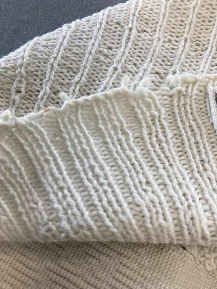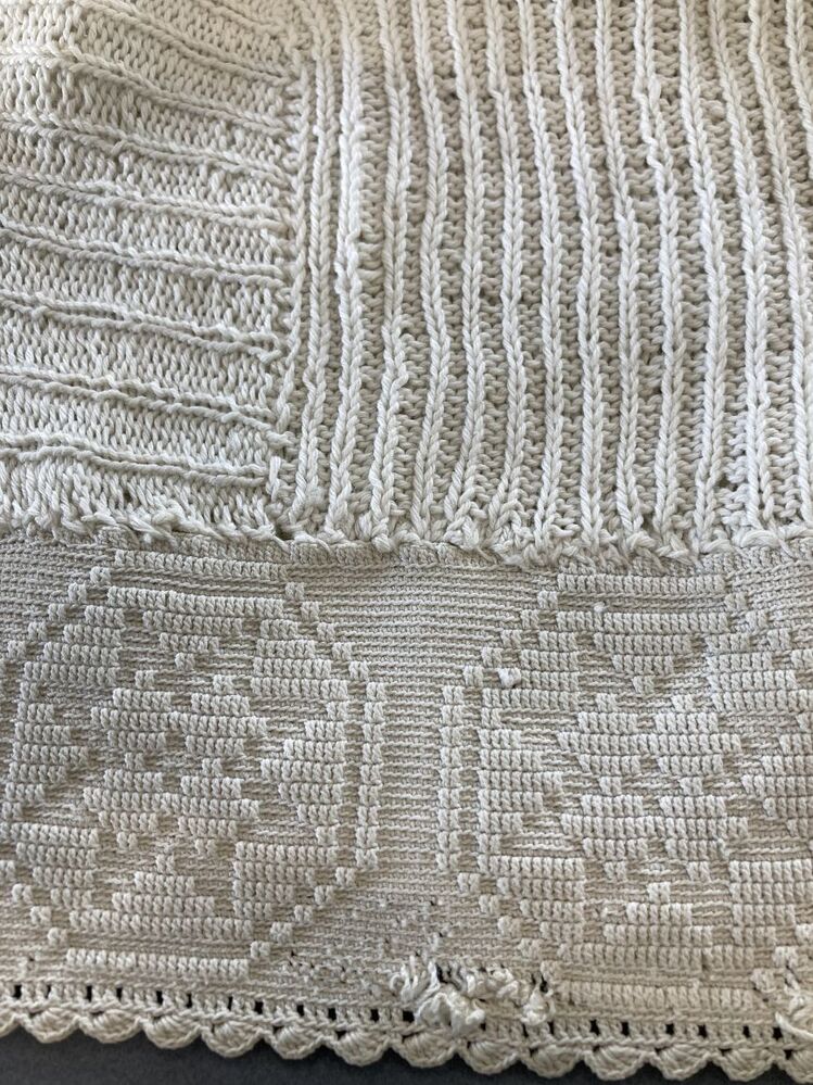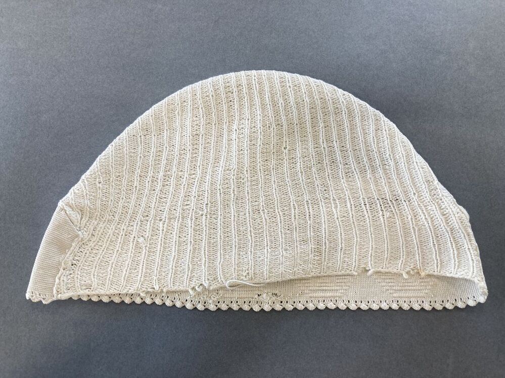 Wit katoenen ondermuts met gebreide bol en gehaakte achterstrook met achtoeken met sterren erin.