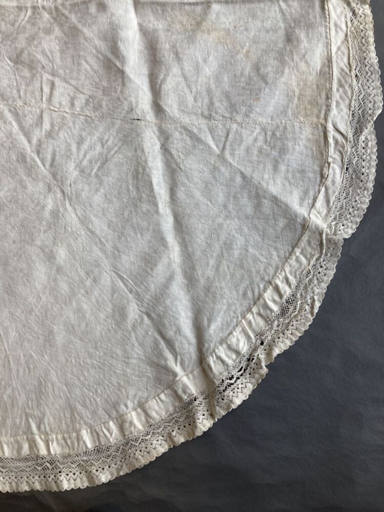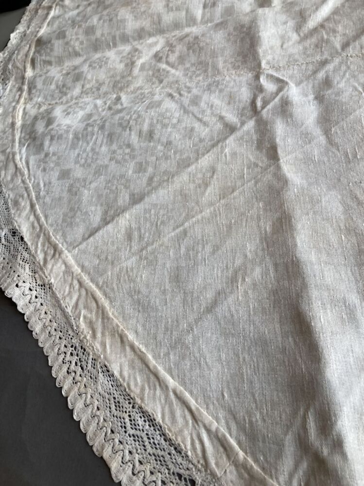 Rond linnen tafelkleed van oud damast met machinale kantrand