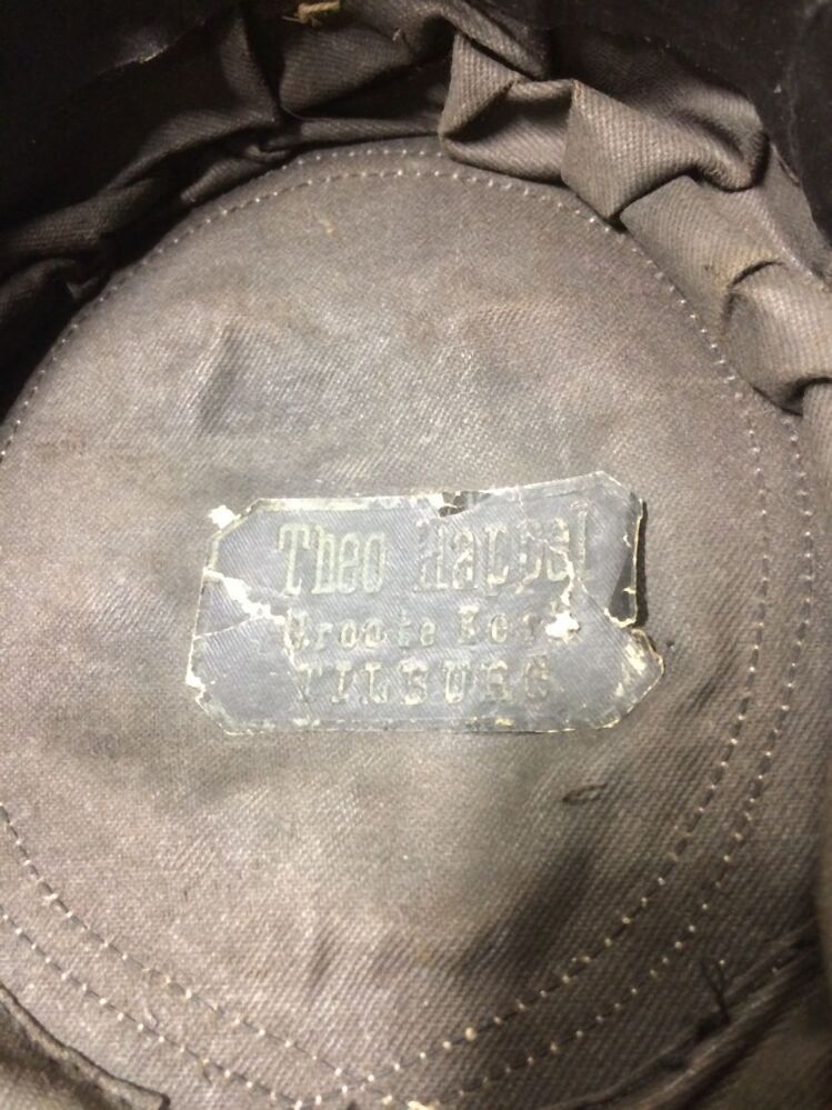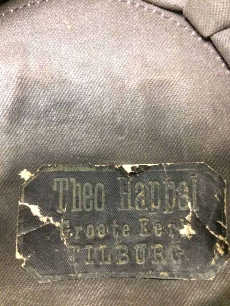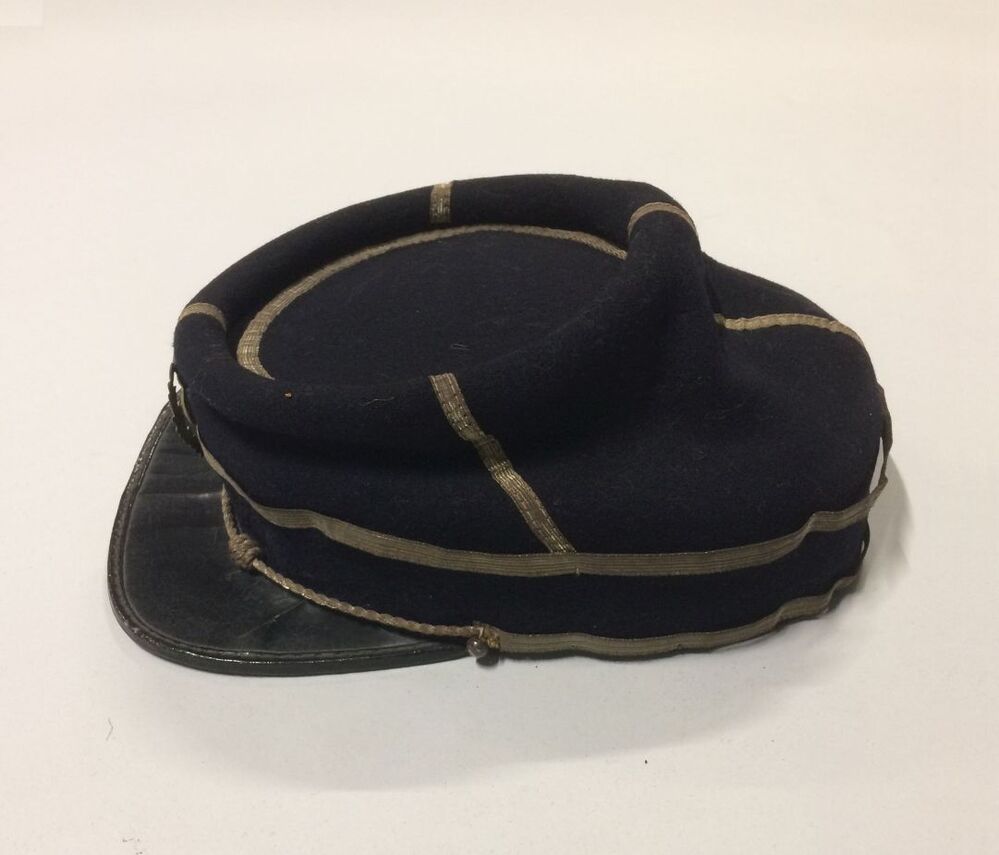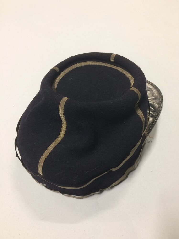 Petje van donkerblauw laken met zilver galon biezen en zeildoek klep van muziekvereniging
