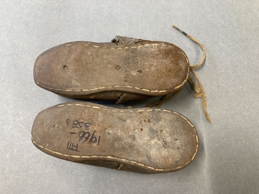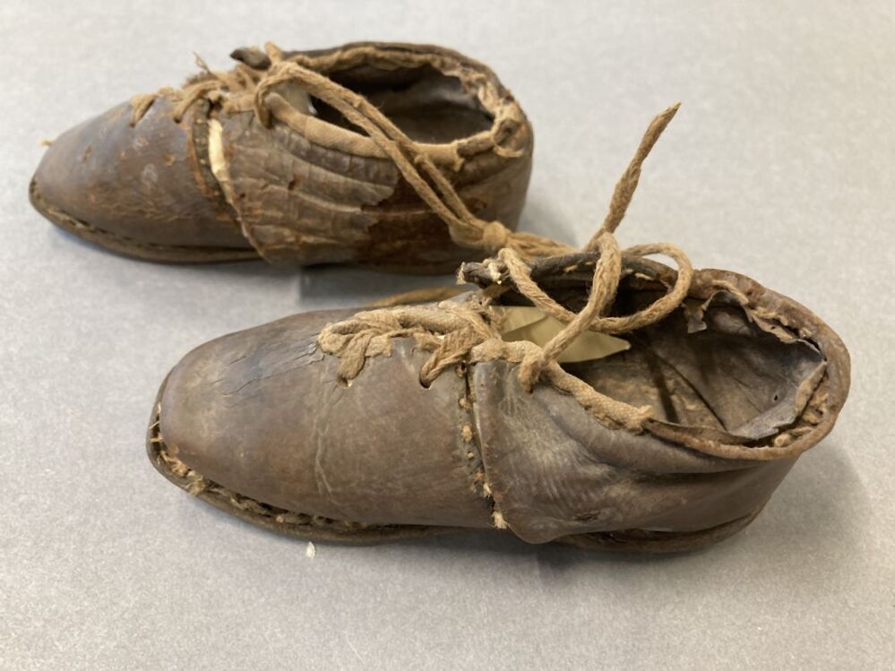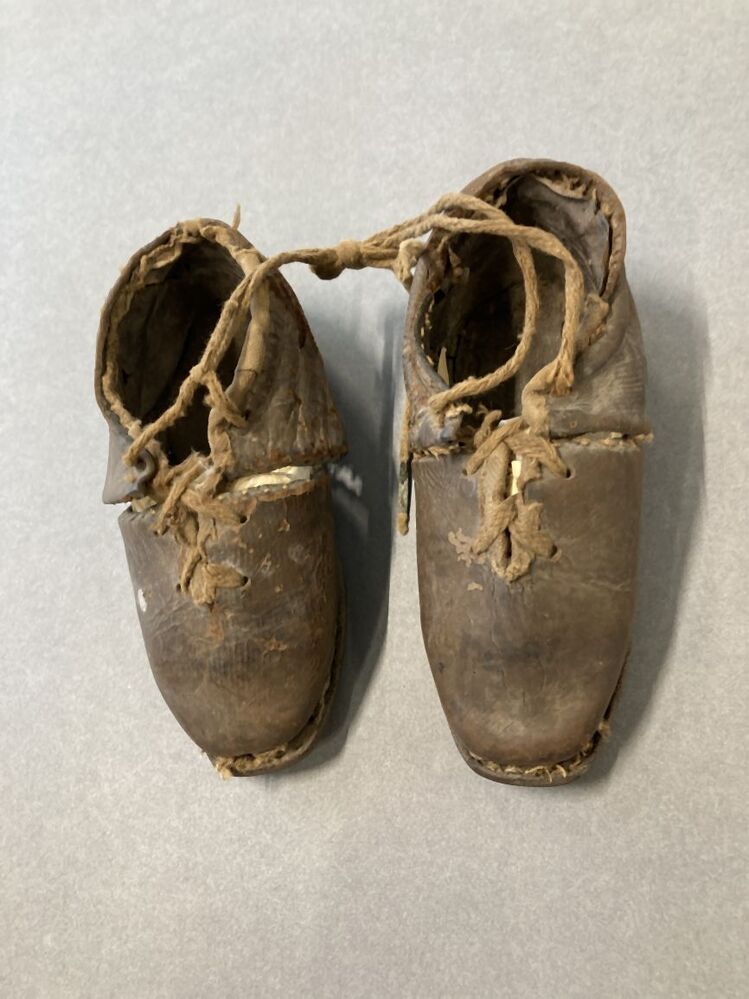 Paar bruinleren veterschoenen met vierkante neus en rechte zool, de hak is breder dan de voorvoet