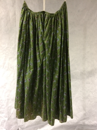 Jak met rok van groen bedrukte katoen, fijn bloempjespatroon in lichtblauw, rood, geel en bruin, het jak heeft een lange schoot en lange mouwen, het bovengedeelte van het jak en de mouwen van binnen met witte flanel gevoerd, jak iets verschoten