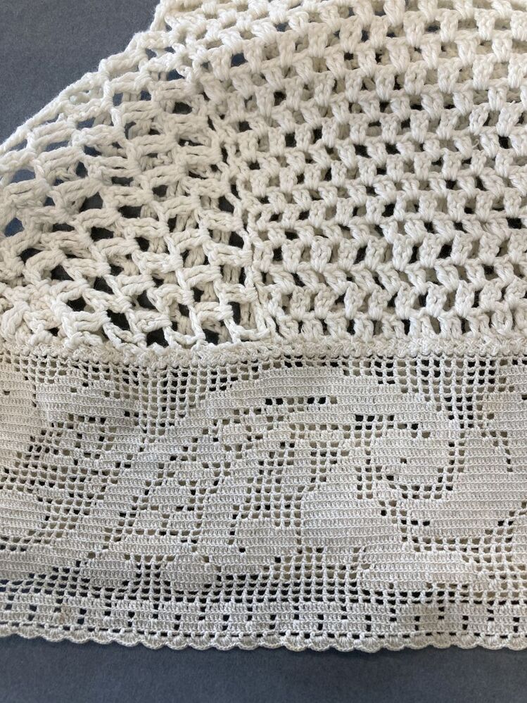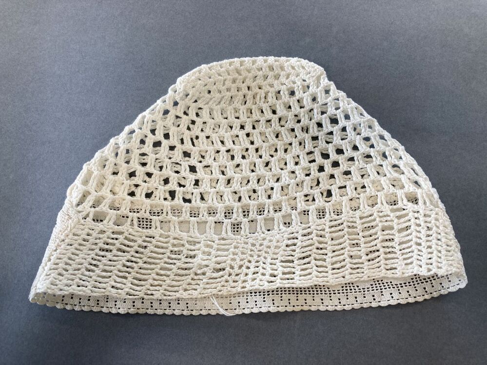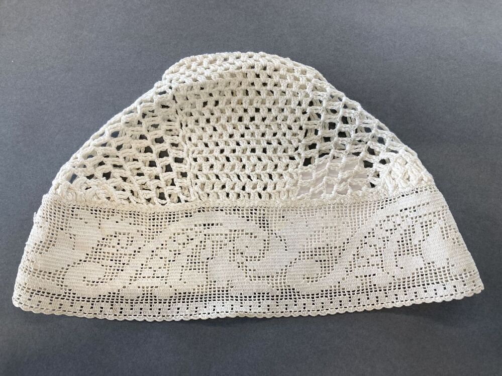 gehaakte wit katoenen tipmuts,met grove opengewerkte bol en strook van fijner filethaakwerk met motief van hoorn des overvloeds