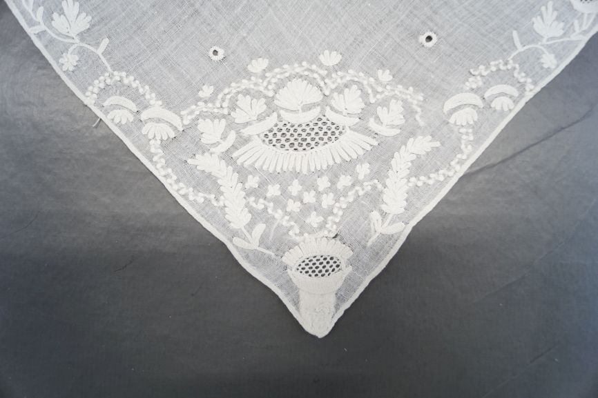 Verwijst naar werken die zich kenmerken door een patroon of ontwerp dat is uitgevoerd in met draad of fijn metaaldraad gemaakte steken. De patronen worden gewoonlijk uitgevoerd op stof, maar ook leer, papier of andere media kunnen worden gebruikt; de werken kunnen bedoeld zijn om ingelijst te worden of om kleding, bedtextiel, meubelbekleding, kussens, altaarkleden, ceremoniële voorhangen of andere zaken te versieren. (AAT)