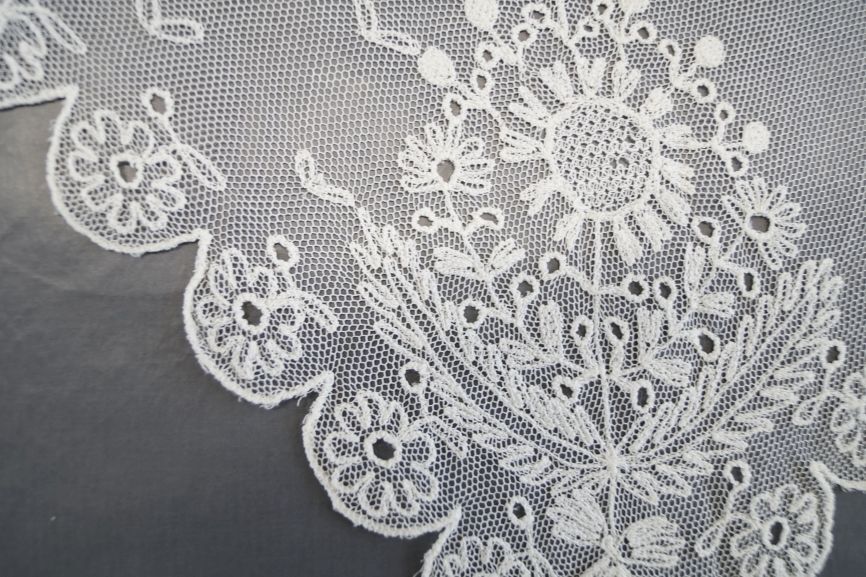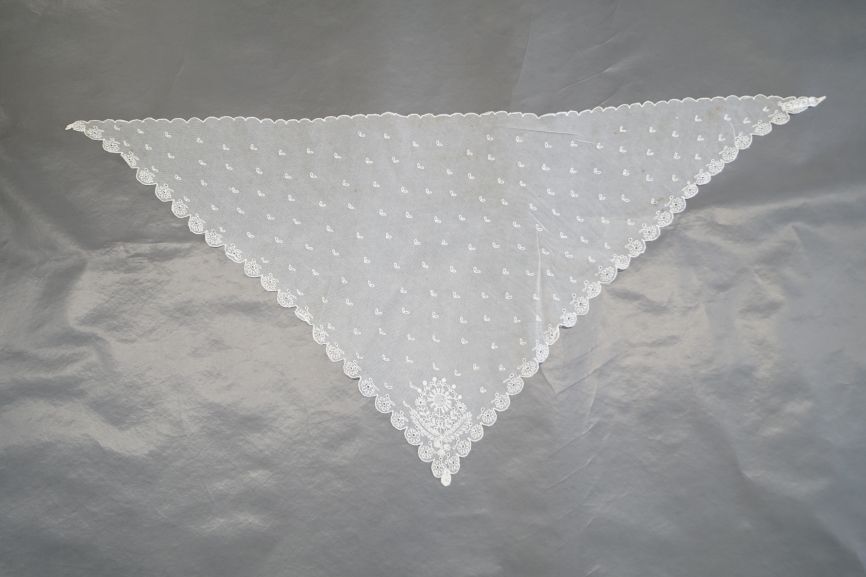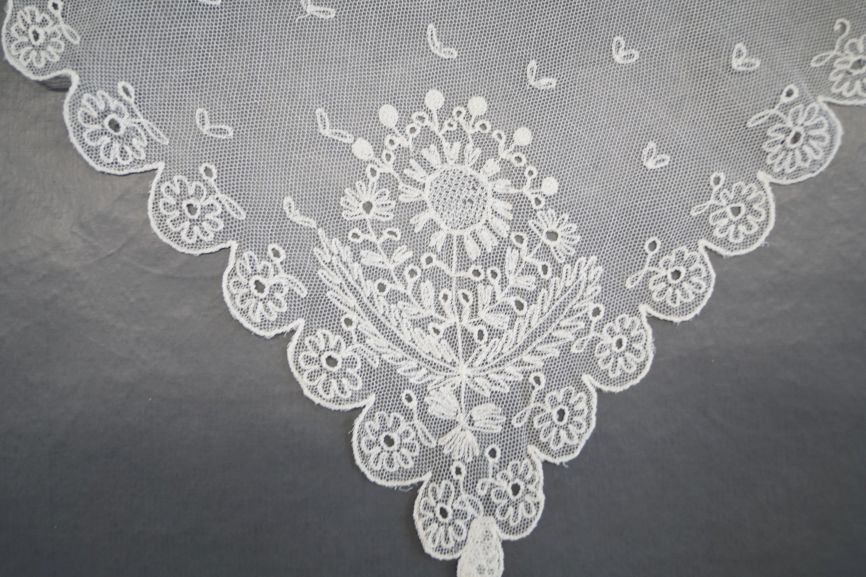 Fichu van witte tule bezaaid met V-vormige vlinderachtige motieven