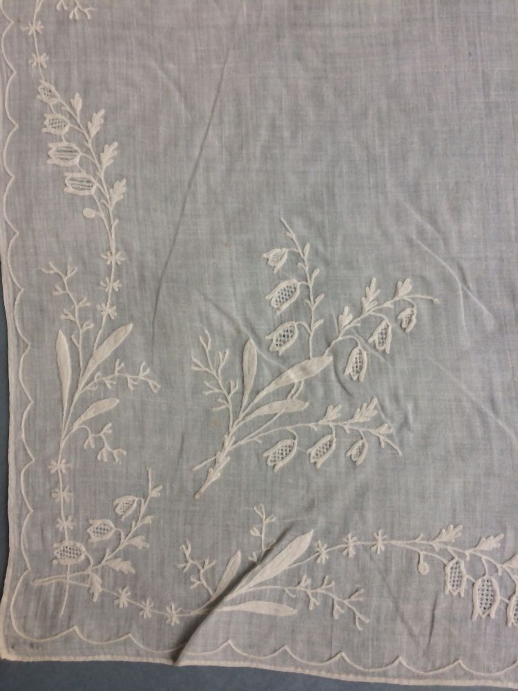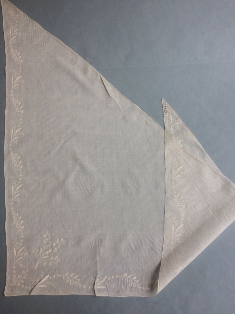 Fichu van witte batist, langs de randen klokjesbloemen rank-patroon en hoekmotief met boeketje