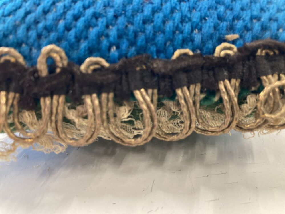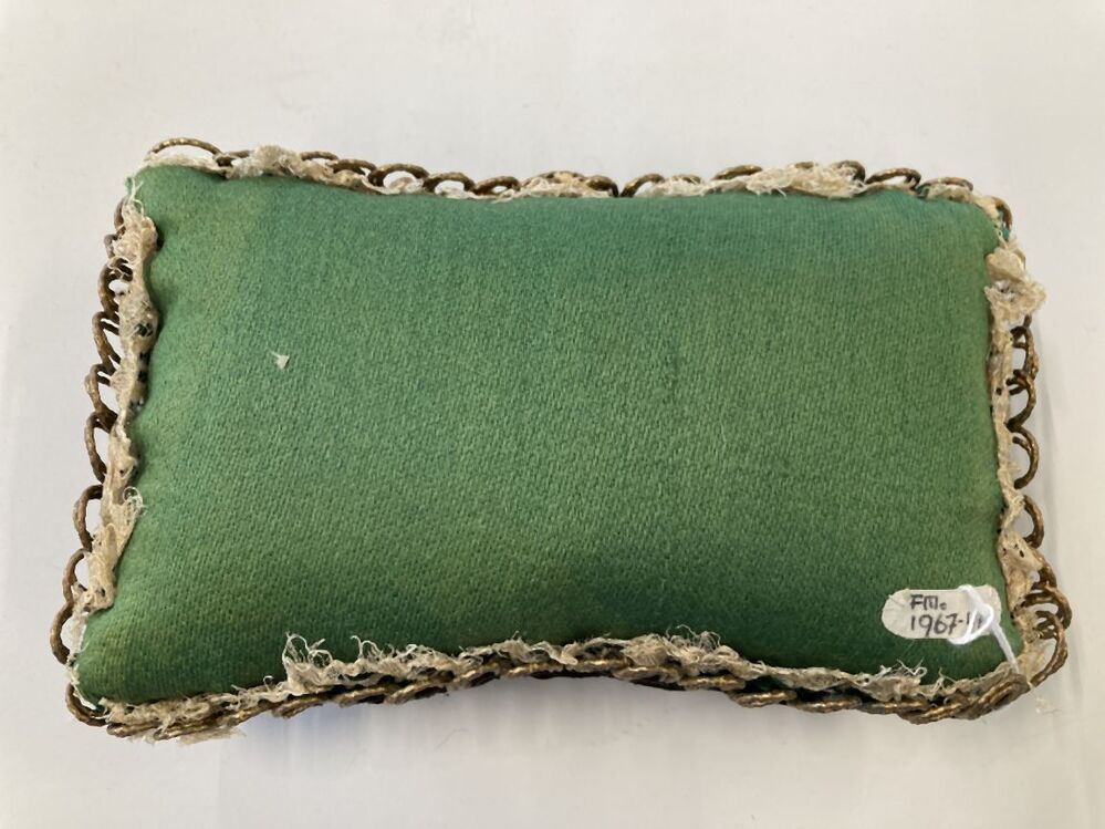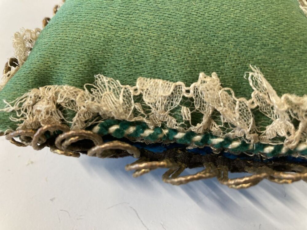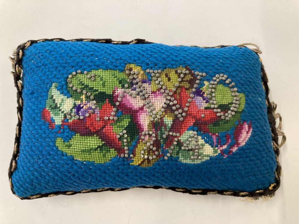 Bakerspeldenkussen, tapisserie met wol en zijde blauw fond met bloemmotief en de letters SAWO 1874