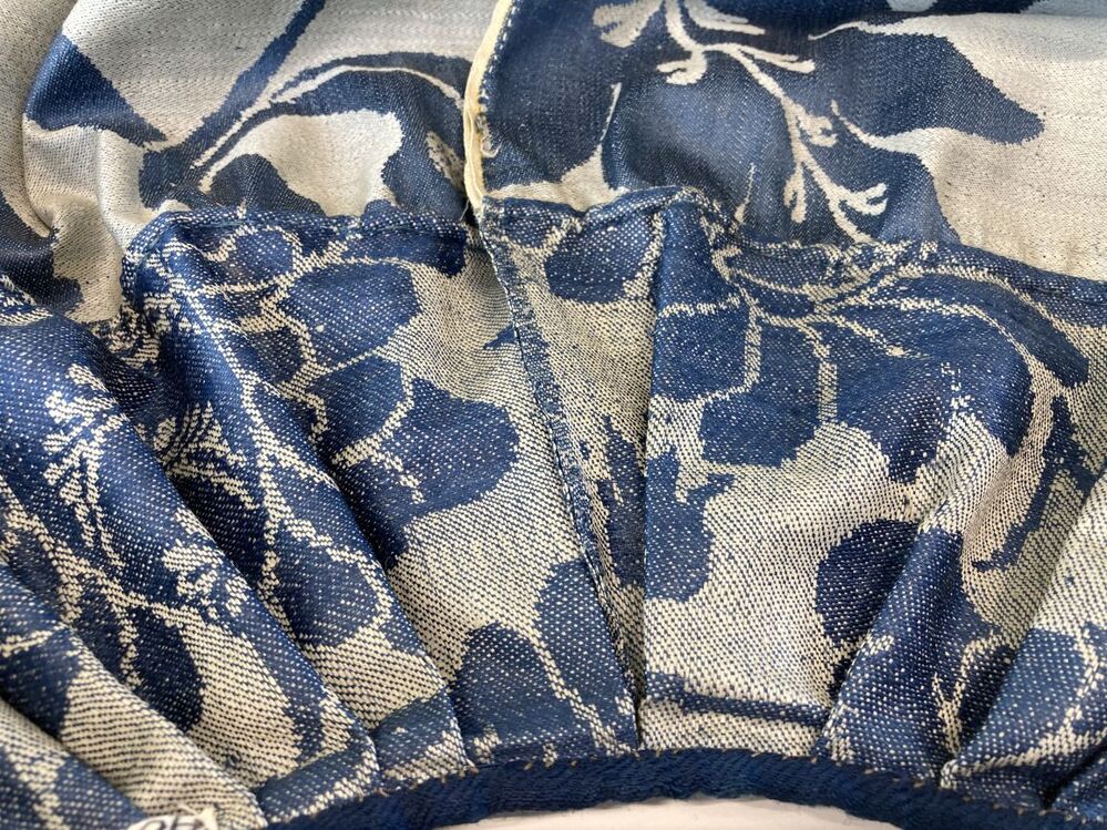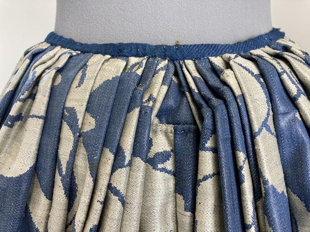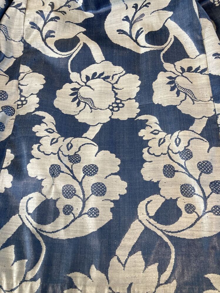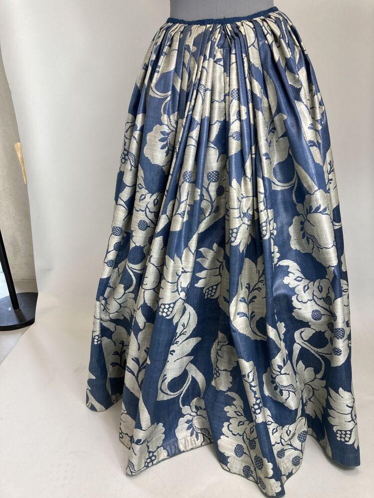 Glanzende blauwe damast rok van 'flowered satin' met grote witte ingeweven bloemen