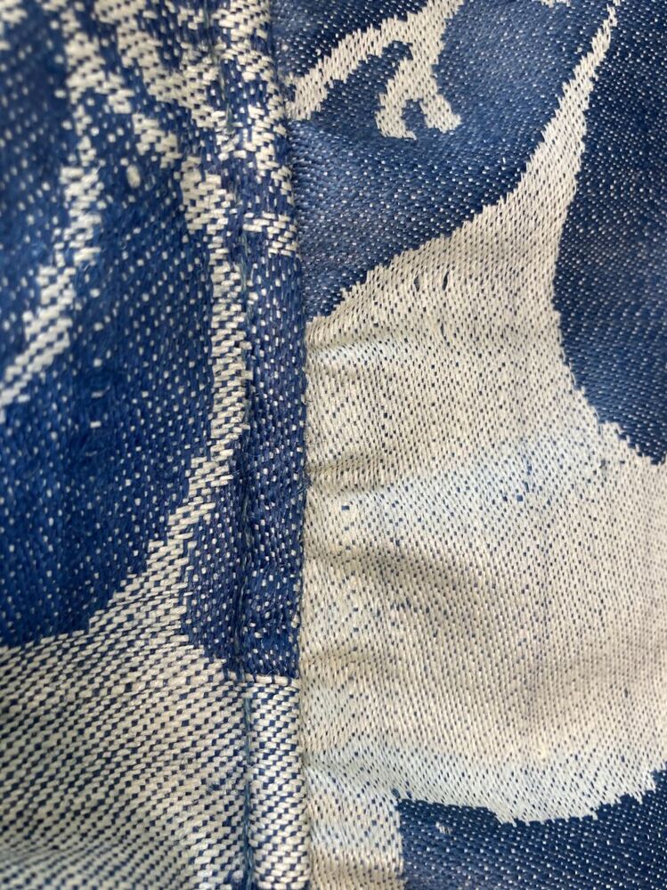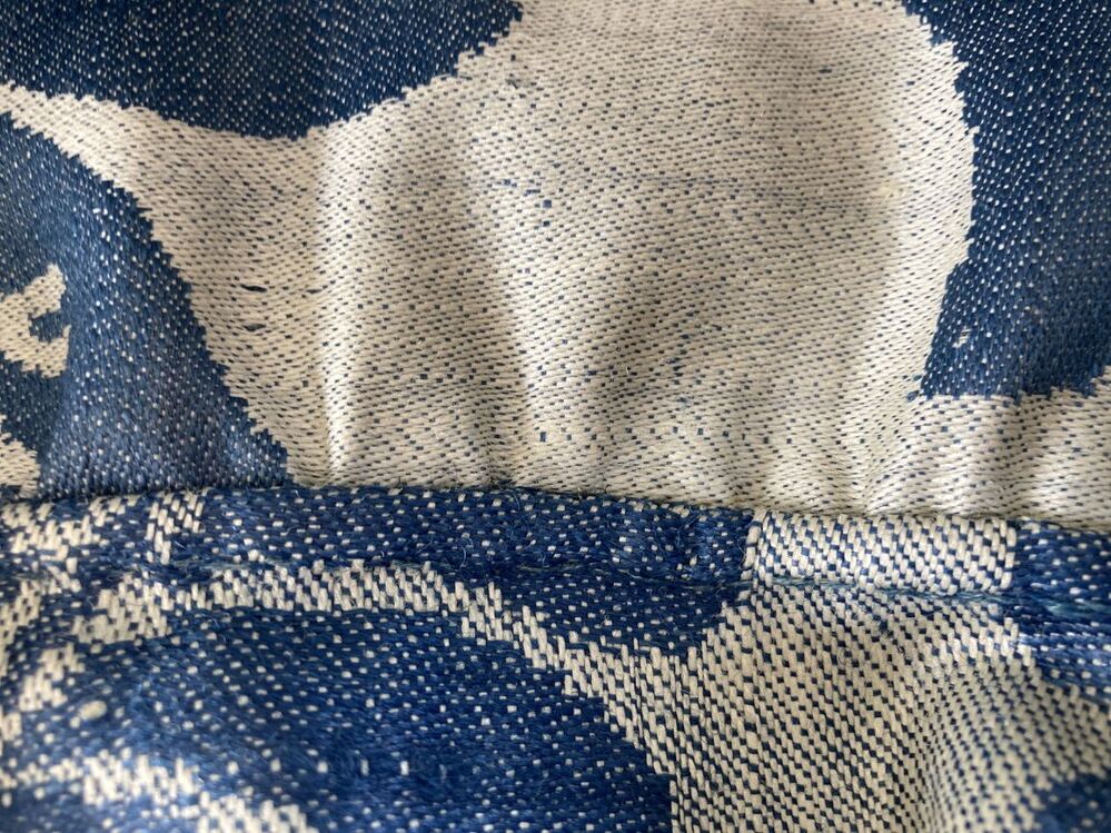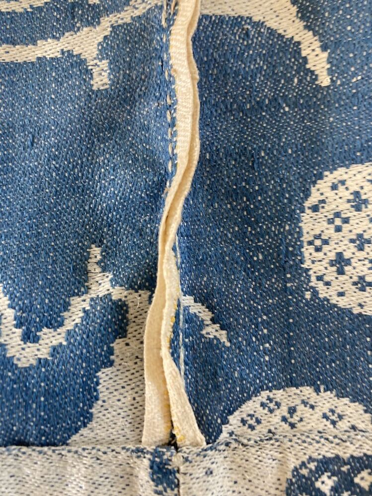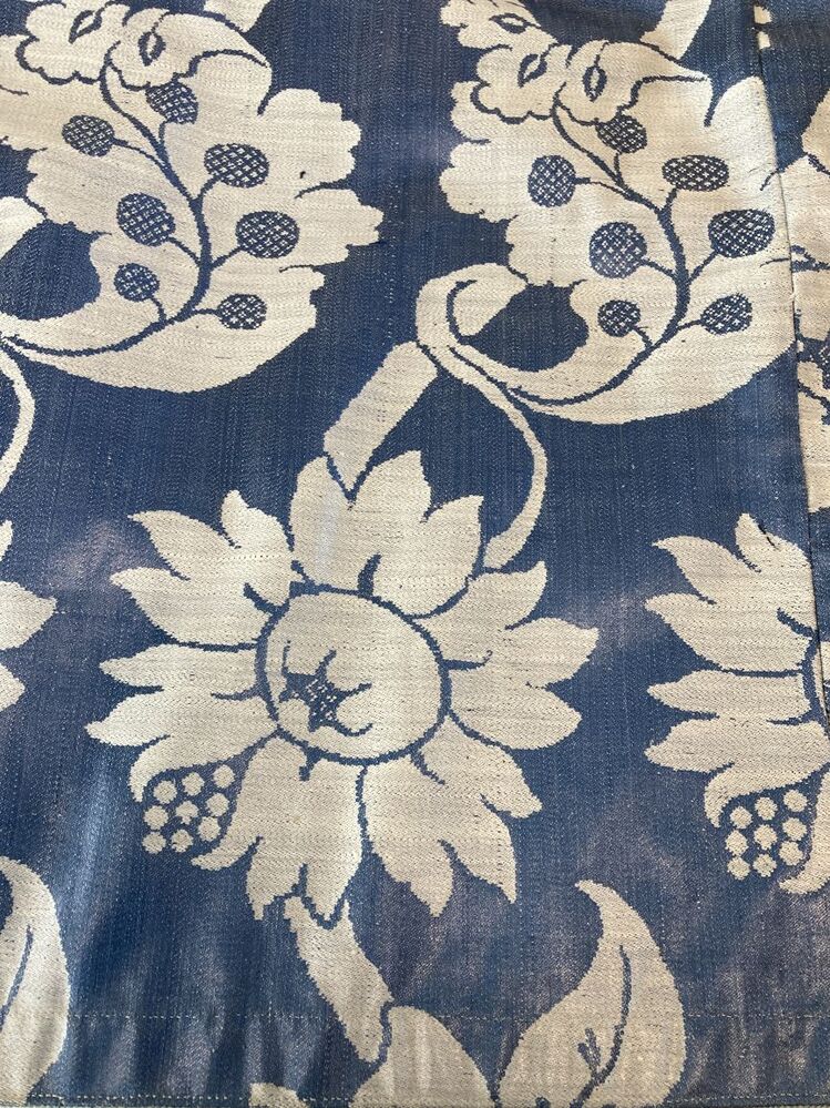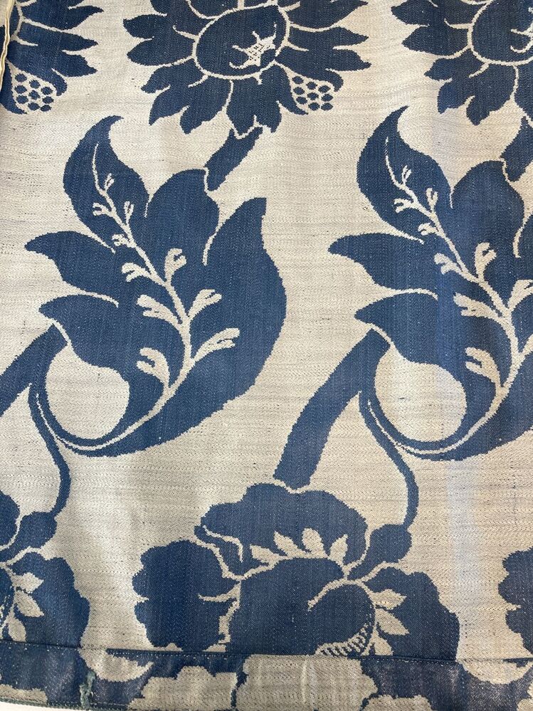 Glanzende blauwe damast rok van 'flowered satin' met grote witte ingeweven bloemen