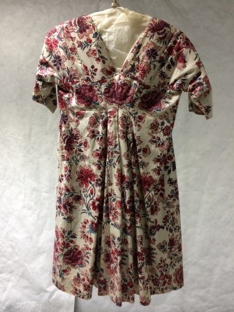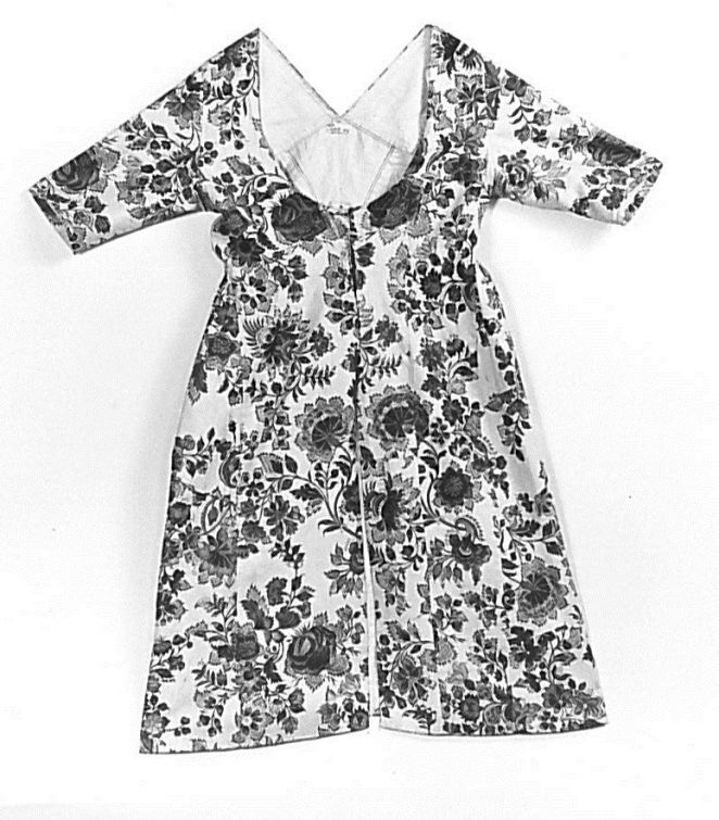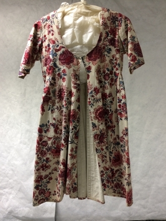 Sitsen vrouwenjak met hoge taille, beschilderd met in elkaar grijpende bloemtakken met grote bloemen op witte grond