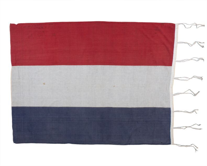Rood-wit-blauwe vlag van katoen, aangeboden aan Jan Baukes de Jong, die in 1907 met de eerste lading terpmodder weg voer van de Burmaniaterp te Ferwerd