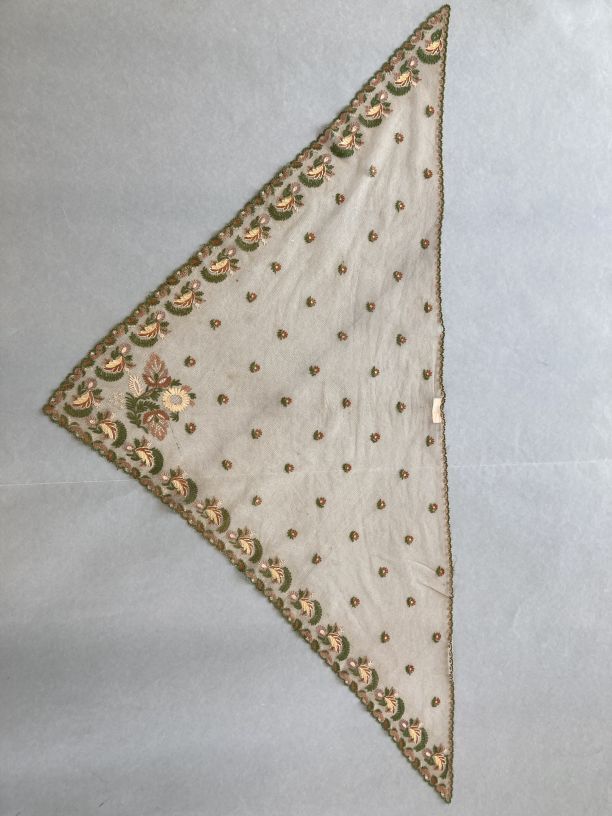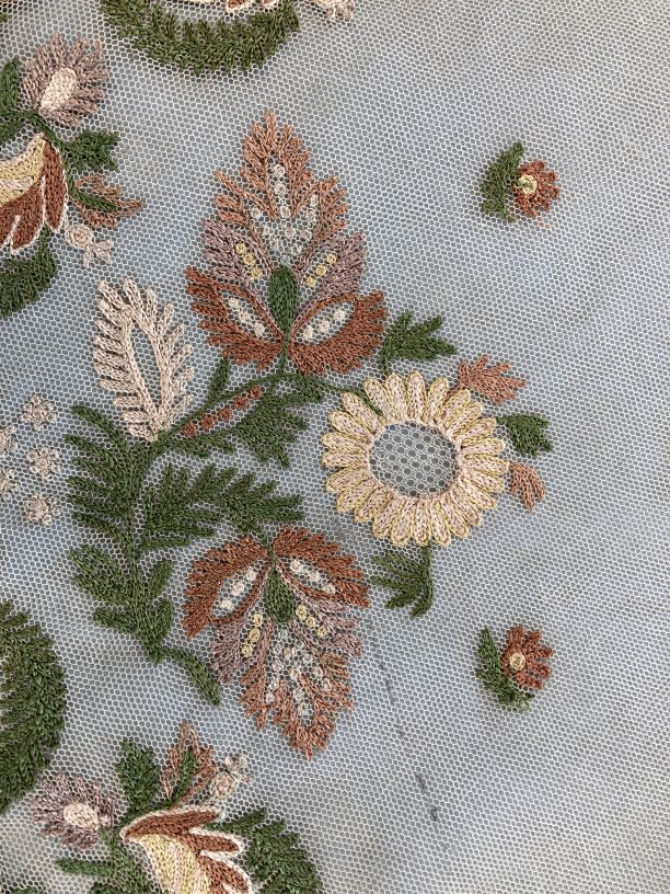 Fichu van crême tule versierd met bloemmotieven in gekleurd zijden garen