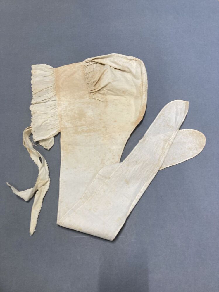 Witte katoenen slaapmuts met lange keelbanden, van binnen gemerkt RH 12