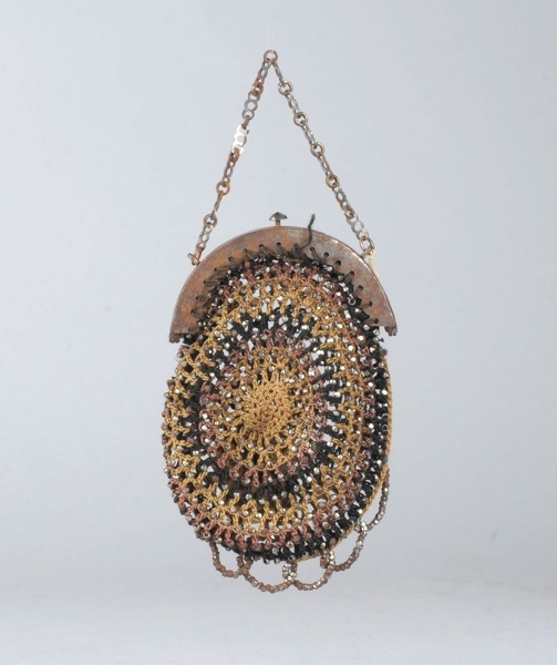 Klein beursje met ijzeren beugel en dito kettinkje en gehaakt tasje waarin kraaltjes zijn verwerkt