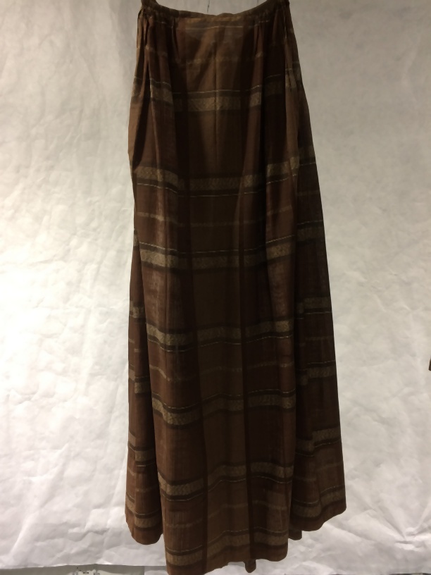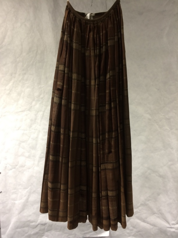 Rok, onderdeel van een bruin geruit wollen kostuum