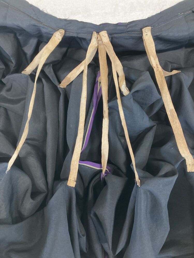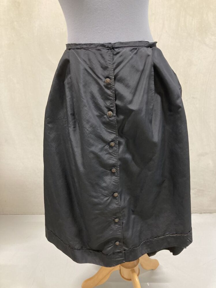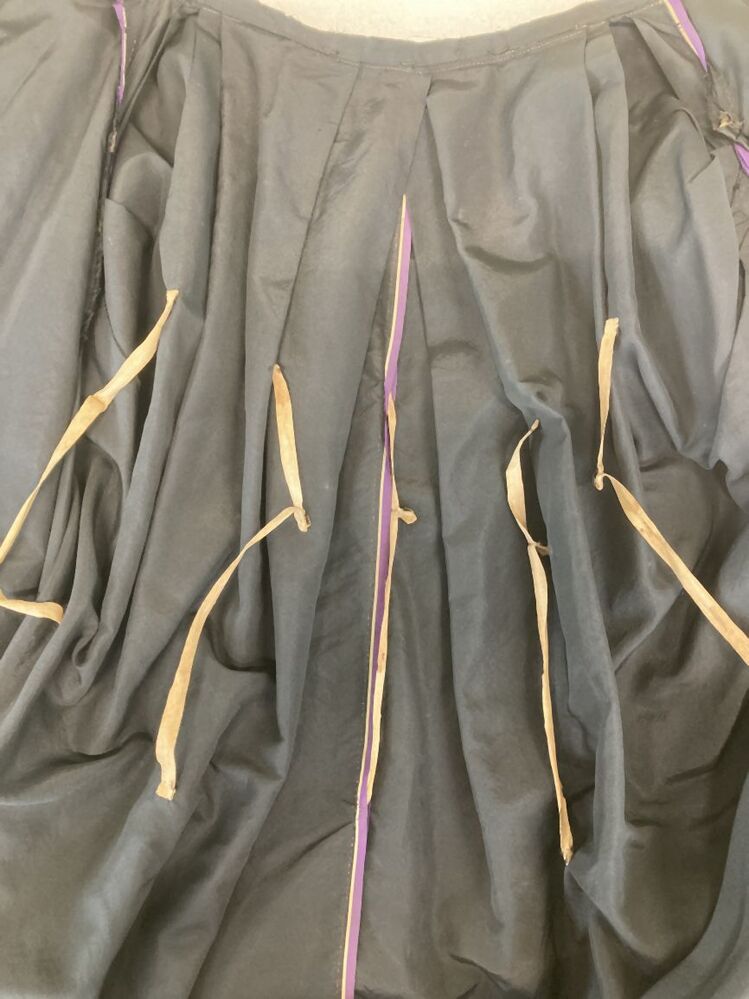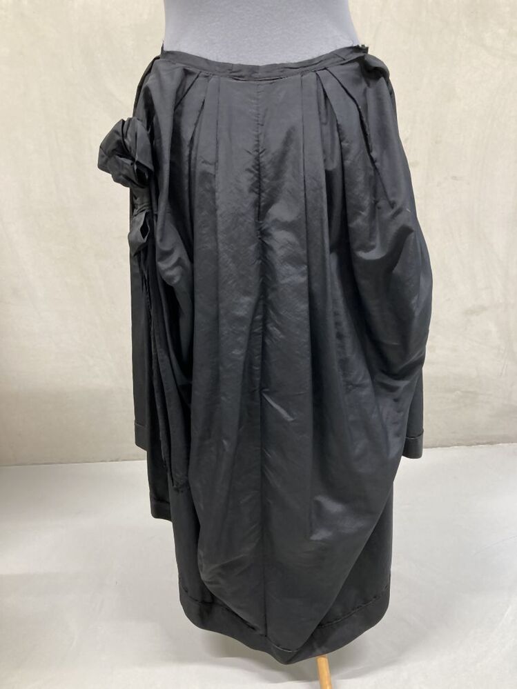 Overrok van kostuum van zwarte zijde (faille) met gedrapeerde achterkant, strik links opzij