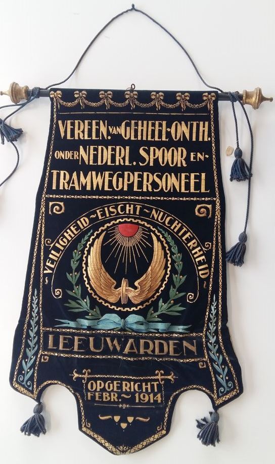 Vaandel waarop VEREEN.VAN GEHEEL-ONTH. ONDER NEDERL. SPOOR en TRAMWEG PERSONEEL LEEUWARDEN. VEILIGHEID-EISCHT-NUCHTERHEID. LEEUWARDEN. OPGERICHT FEBR.1914