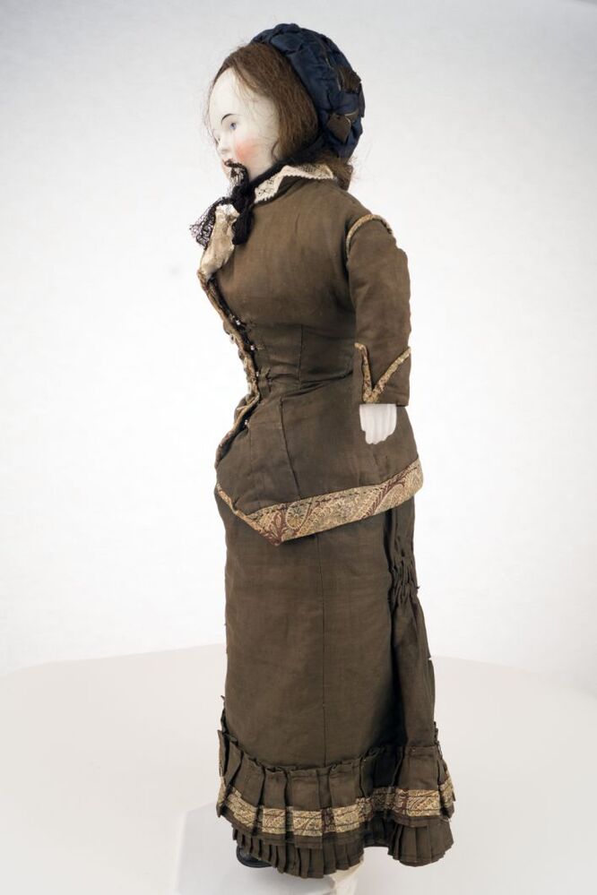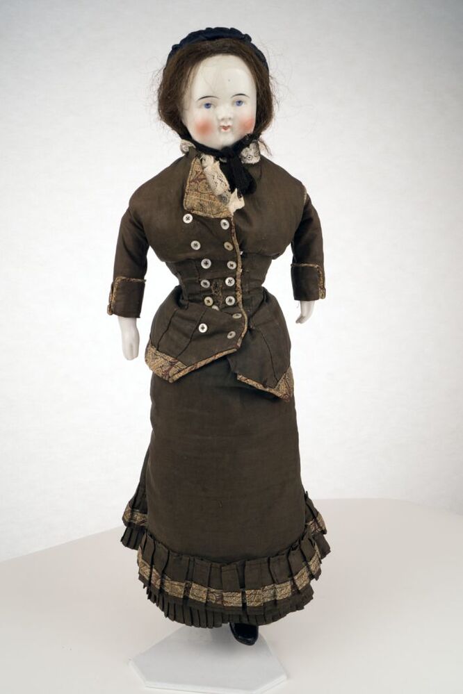 Pop met porseleinen kop en armen, gekleed in kostuum van ± 1875, onderdeel van groep van tien
