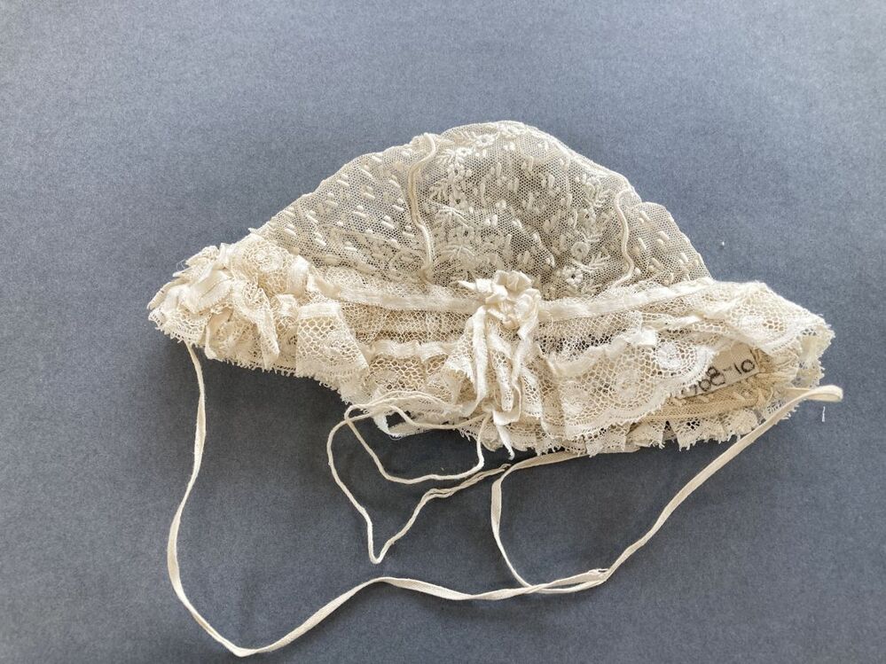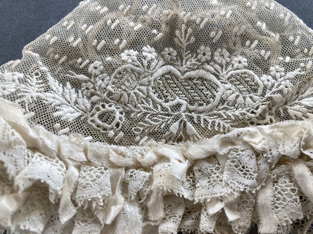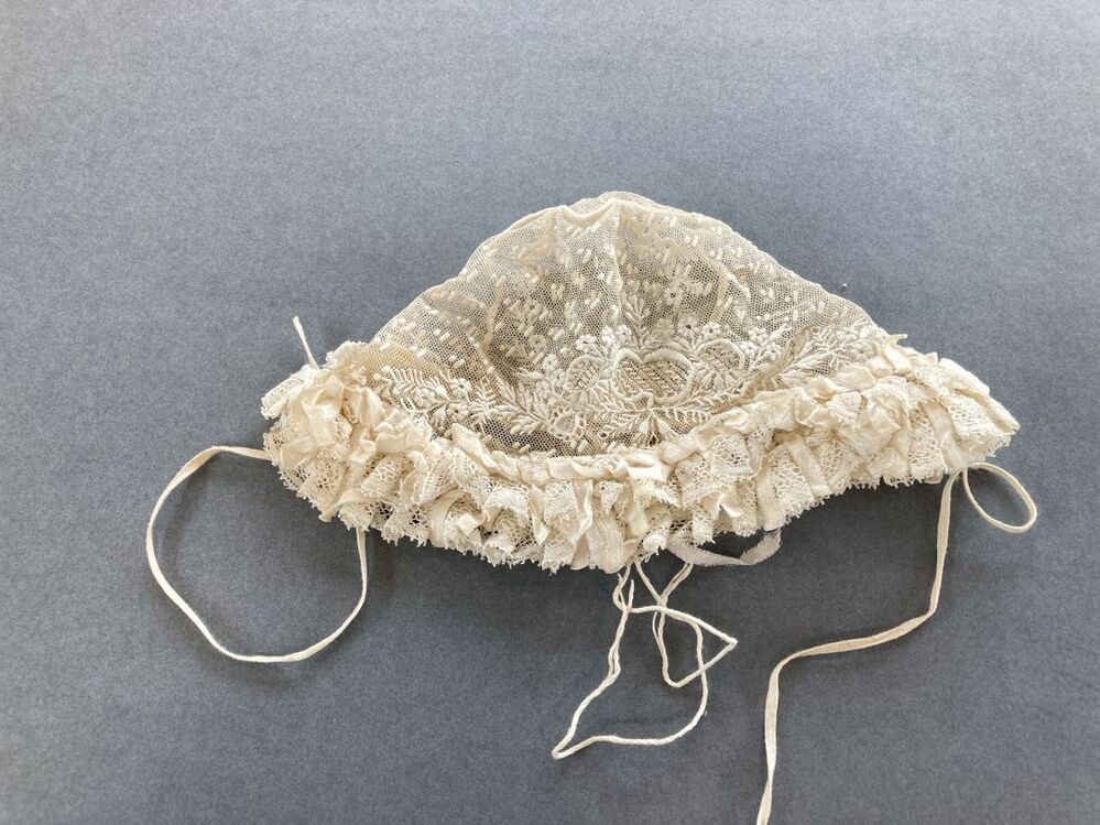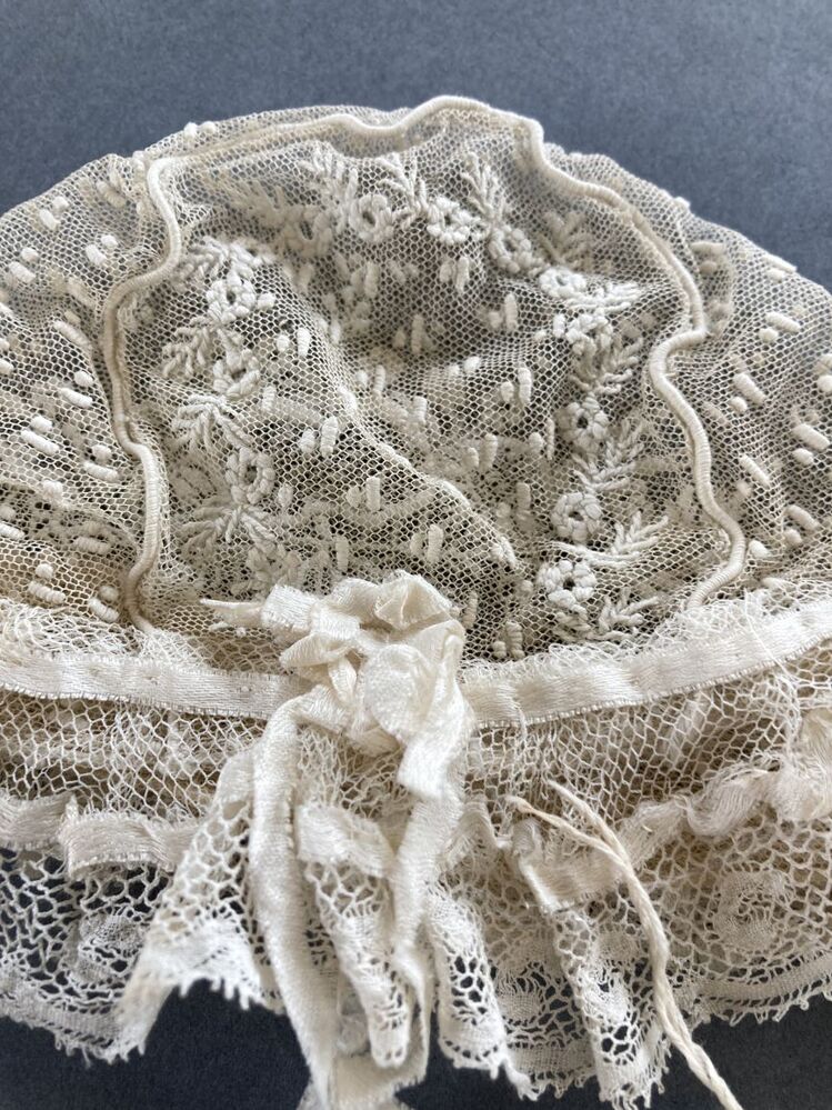 Muts van gekloste tule versierd met doorstopwerk, afgezet met gekloste kant