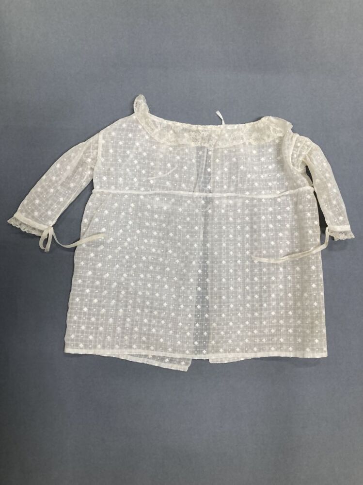 Japonnetje van neteldoek met ingeweven ruit met gebrocheerde pijltjes en stippen