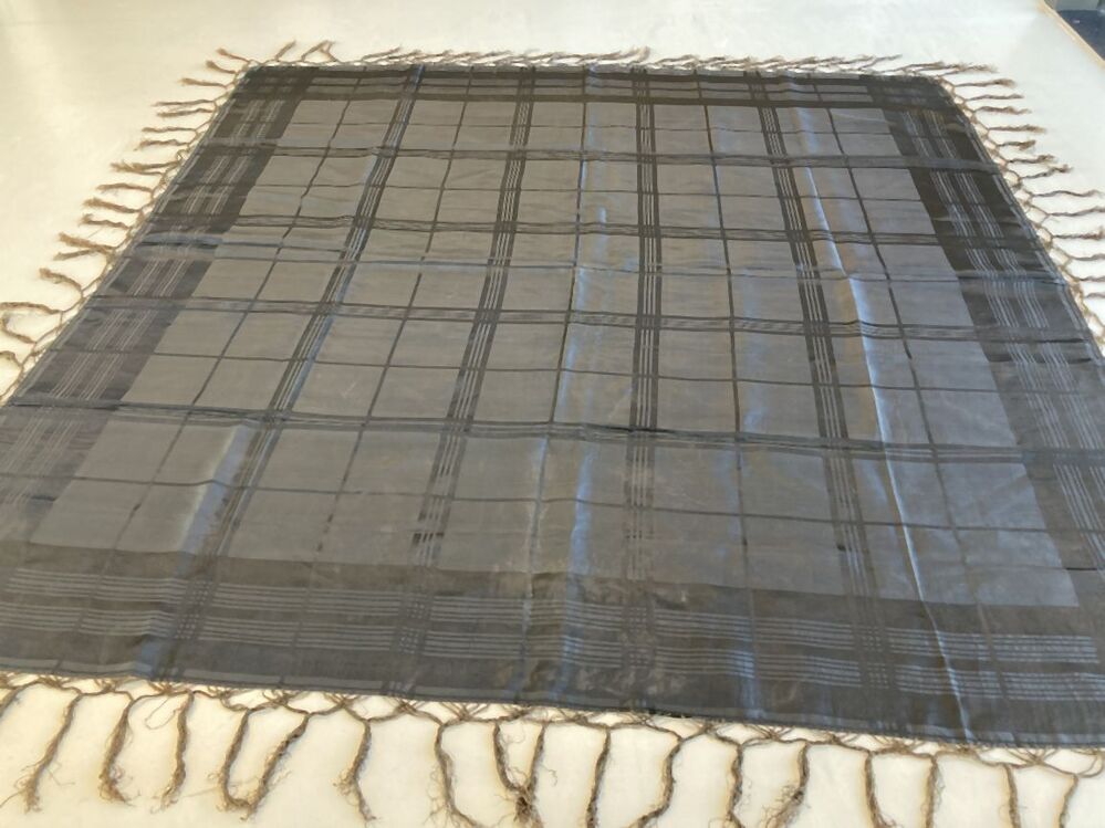 Grote omslagdoek van geruite zwarte faille zijde met geknoopte franje